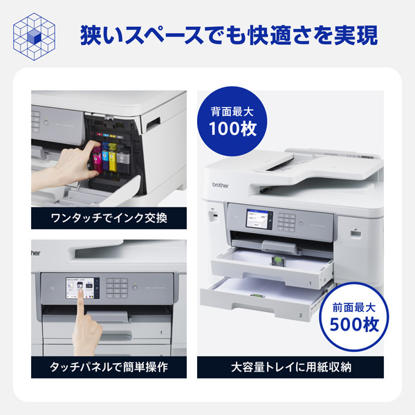 インク交換、用紙補充を本体前面で完結できるフロントオペレーションを採用。
