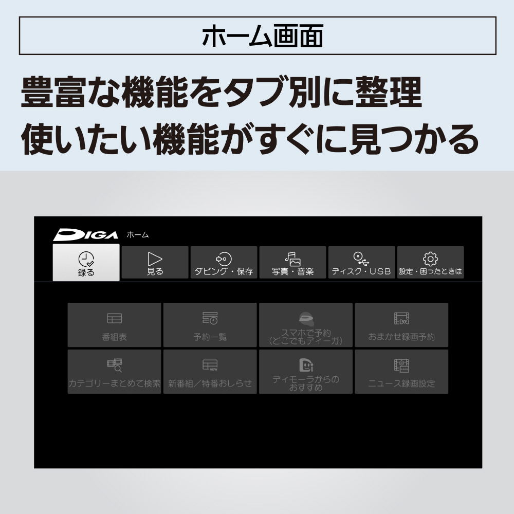 ドラマ・アニメを自動録画して約90日間お録りおき、「ホーム画面」をリニューアルしディーガ全機種で統一したUIスタンダードモデルの4Kレコーダー