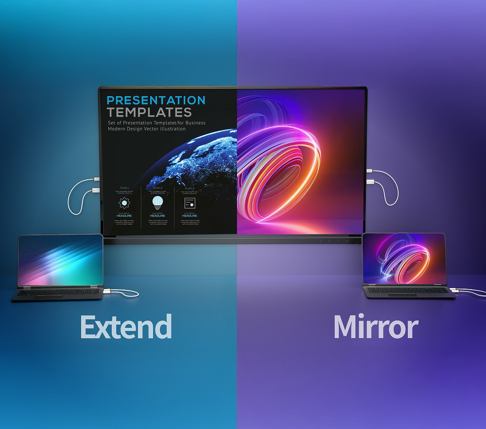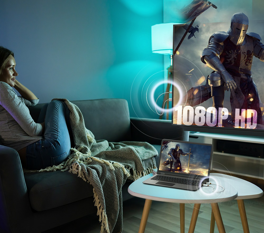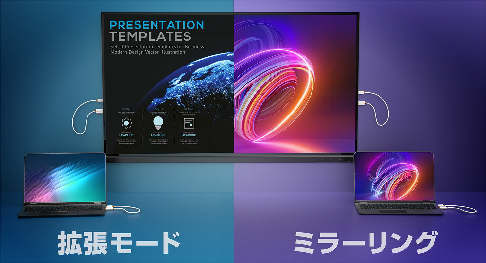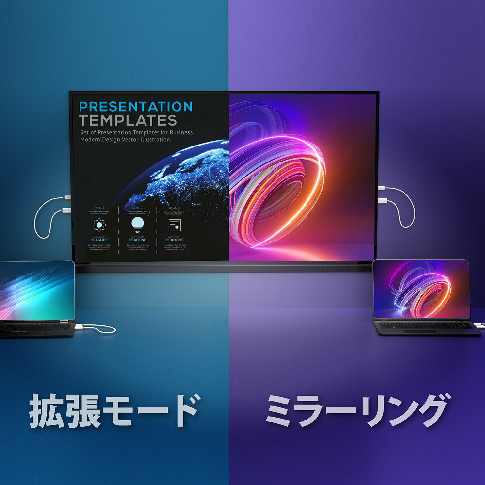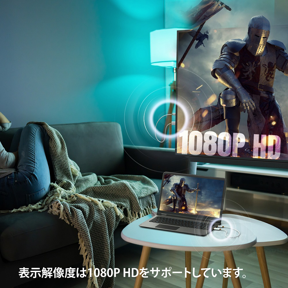 HDCP に対応しているため、PC で再生する有料コンテンツやゲーム画面もそのまま表示できる点が大きな特長です。フル HD(1080p)の解像度に対応し、送受信機は USB ポートから給電される設計のため、PC やテレビの USB ポートに挿すだけで簡単に使用できます。 ゲーム機にも対応しており、手元にあるゲーム機の映像を離れたテレビへワイヤレスでミラーリングして「無線プレイ」が可能なため、幅広いシーンで活躍します。 さらに、ScreenCast ワイヤレスHDMI送受信機を使用すれば、ノートPCやゲーム機の映像を大画面にワイヤレスで手軽に映し出せます。ケーブル不要でマルチ画面化ができ、作業効率の向上にも役立ちます。