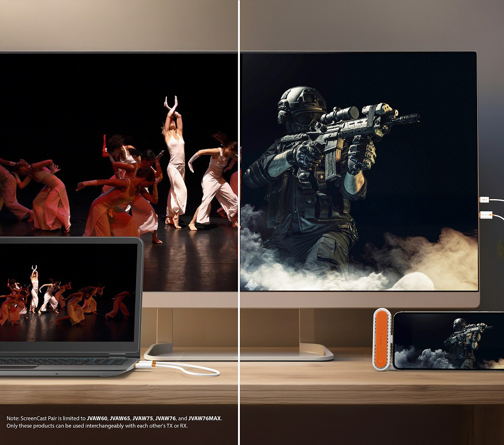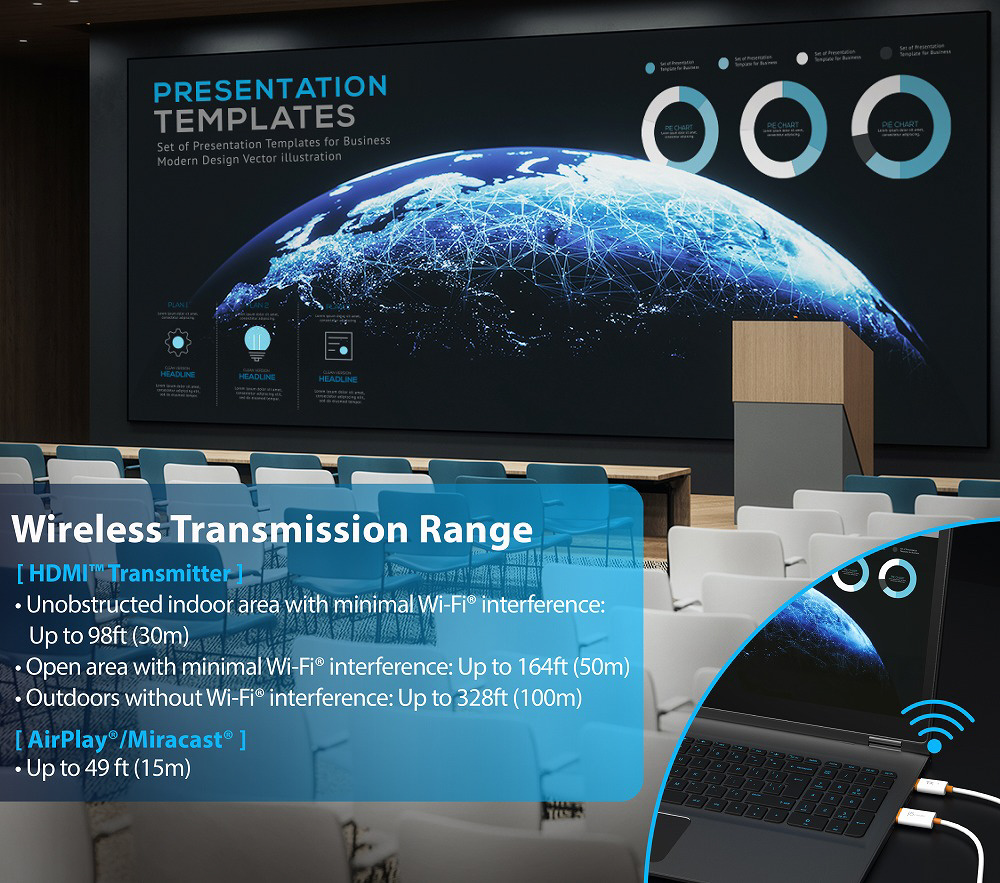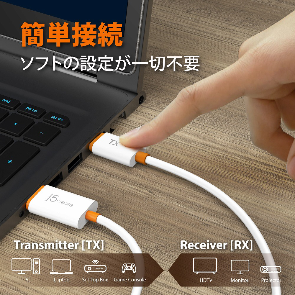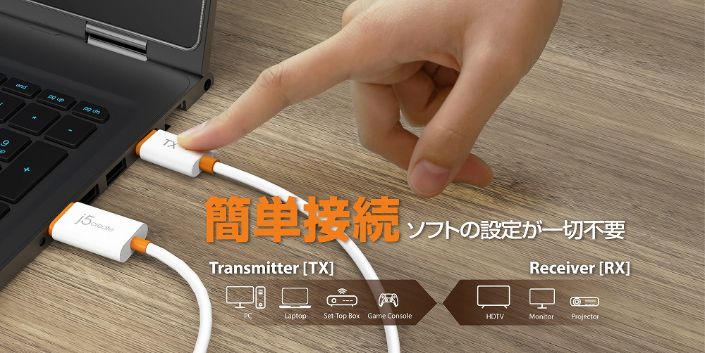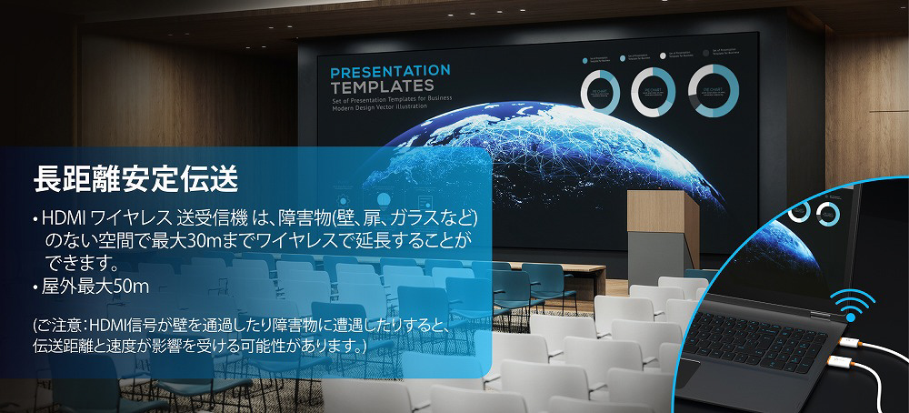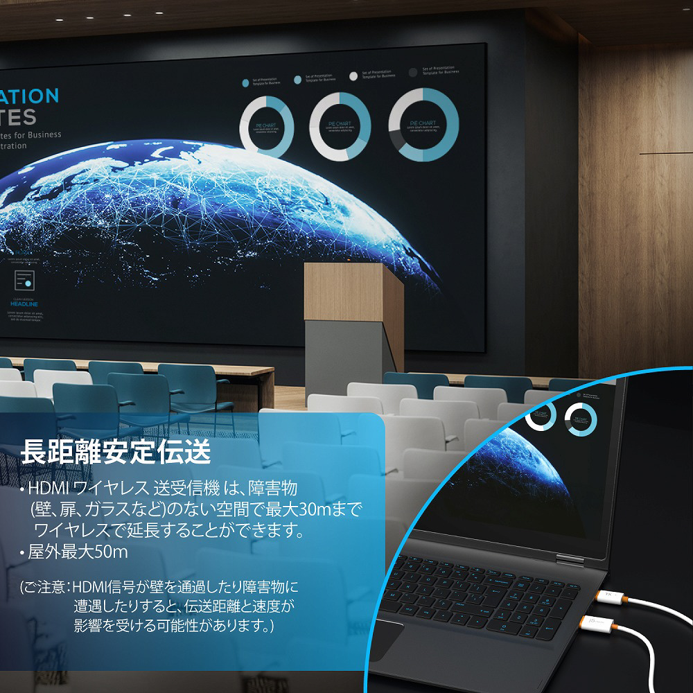 本製品は、すべての HDMI 機器に出力可能な送受信機セットで、ノートPCやゲーム機などの画面を小型の送信機を介して、最大 30m 離れた HDMI ディスプレイへワイヤレスでミラーリングできます。