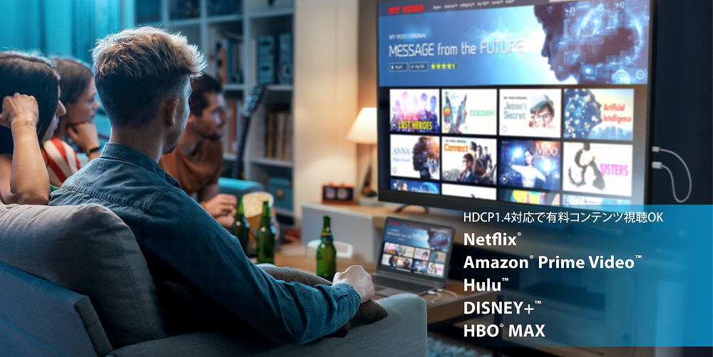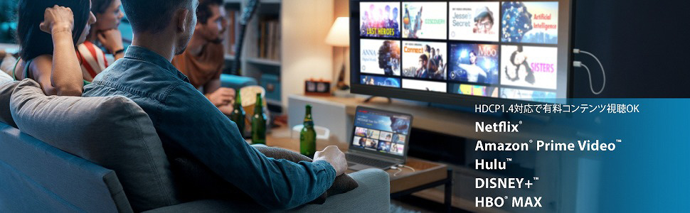 HDCP 1.4 に対応しているため、Netflix、Amazon Prime Video、Hulu などの著作権保護されたコンテンツも視聴可能です。