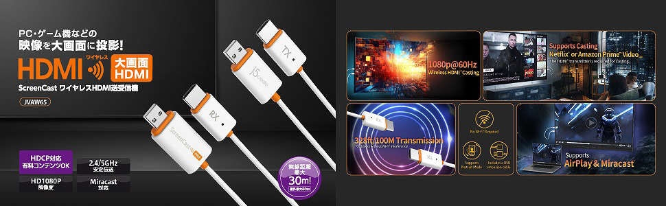 本製品は、すべての HDMI 機器に出力可能な送受信機セットで、ノートPCやゲーム機などの画面を小型の送信機を介して、最大 30m 離れた HDMI ディスプレイへワイヤレスでミラーリングできます。HDCP に対応しているため、PC で再生する有料コンテンツやゲーム画面もそのまま表示できる点が大きな特長です。