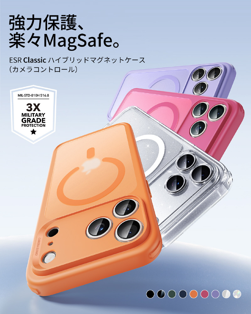米軍規格MIL-STD-810Hの落下試験に合格したエアガードコーナー(認証番号:GZMR231203686802)を採用します。コンクリートへの高さ3.3メートル落下テストにも耐える設計で、駅のホームでの使用や登山中など、アクティブなシーンでも安心できます。うっかり落とした時も、大切なiPhoneを確実にプロテクトします