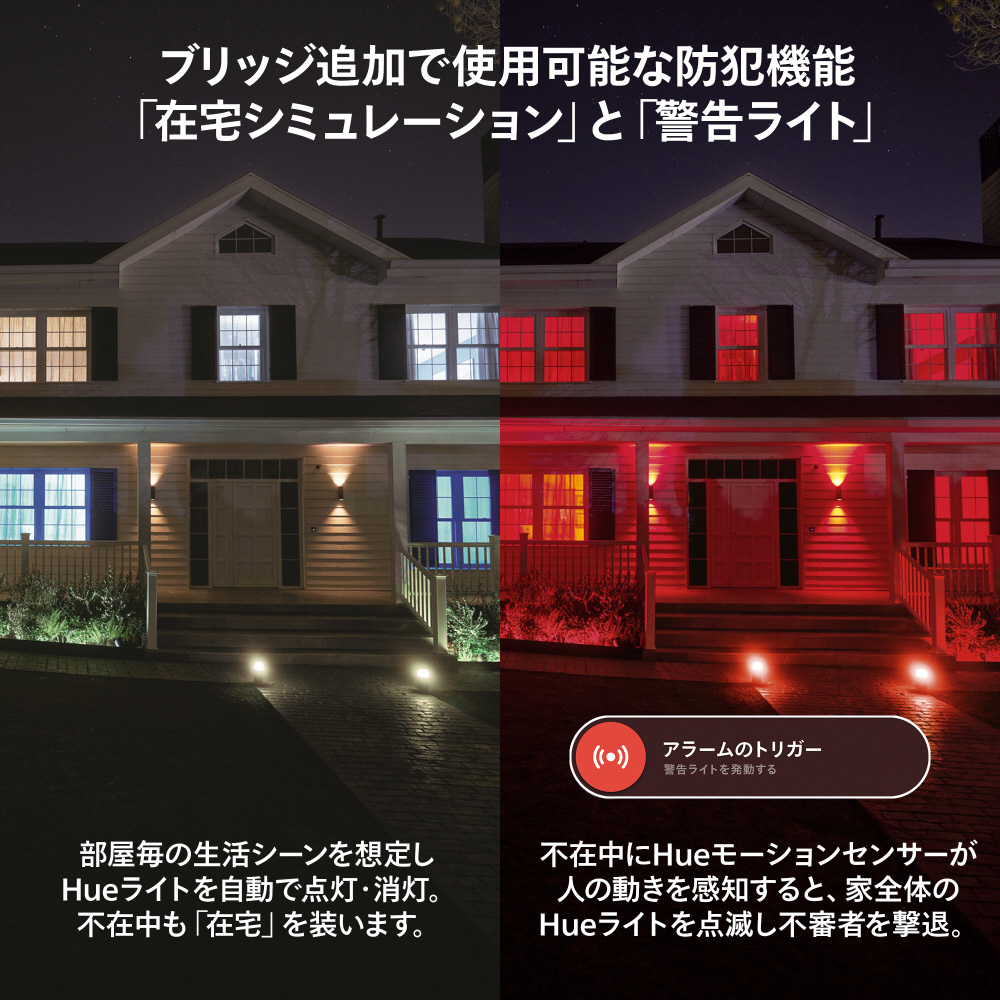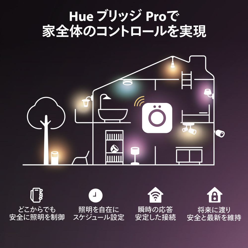 Hue ブリッジがあれば、曜日毎・時間帯毎に明かりのスケジュール化が可能になります。★Hueユーザーおすすめ使用例:(1)仕事時⇒リラックスタイムの明かり自動切替で生活にメリハリをつける。(2)朝のフェードイン点灯により自然な目覚めのサポート。平日と休日で個別設定可能です。(3)フェードアウト消灯によりお子様の寝かしつけに活用。