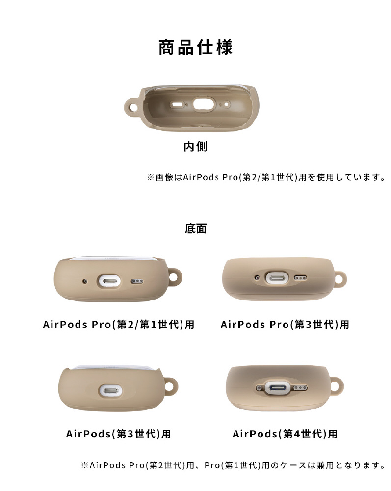 ・AirPodsPro(第2/1世代)、AirPods(第3世代)は「丸いカラビナタイプ」、AirPods Pro(第3世代)、AirPods(第4世代)は「シグネチャーカラビナL」が付属