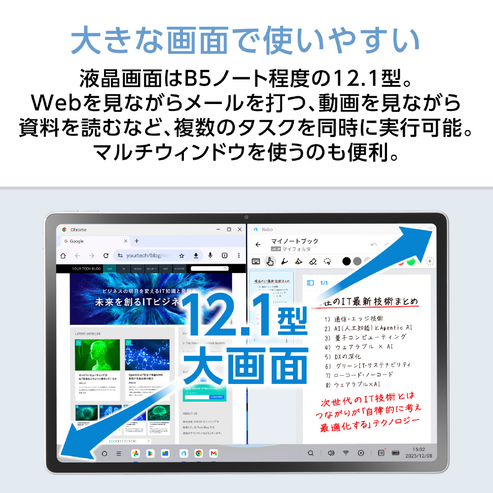 大画面で持ち運びやすい設計の12.1型タブレット