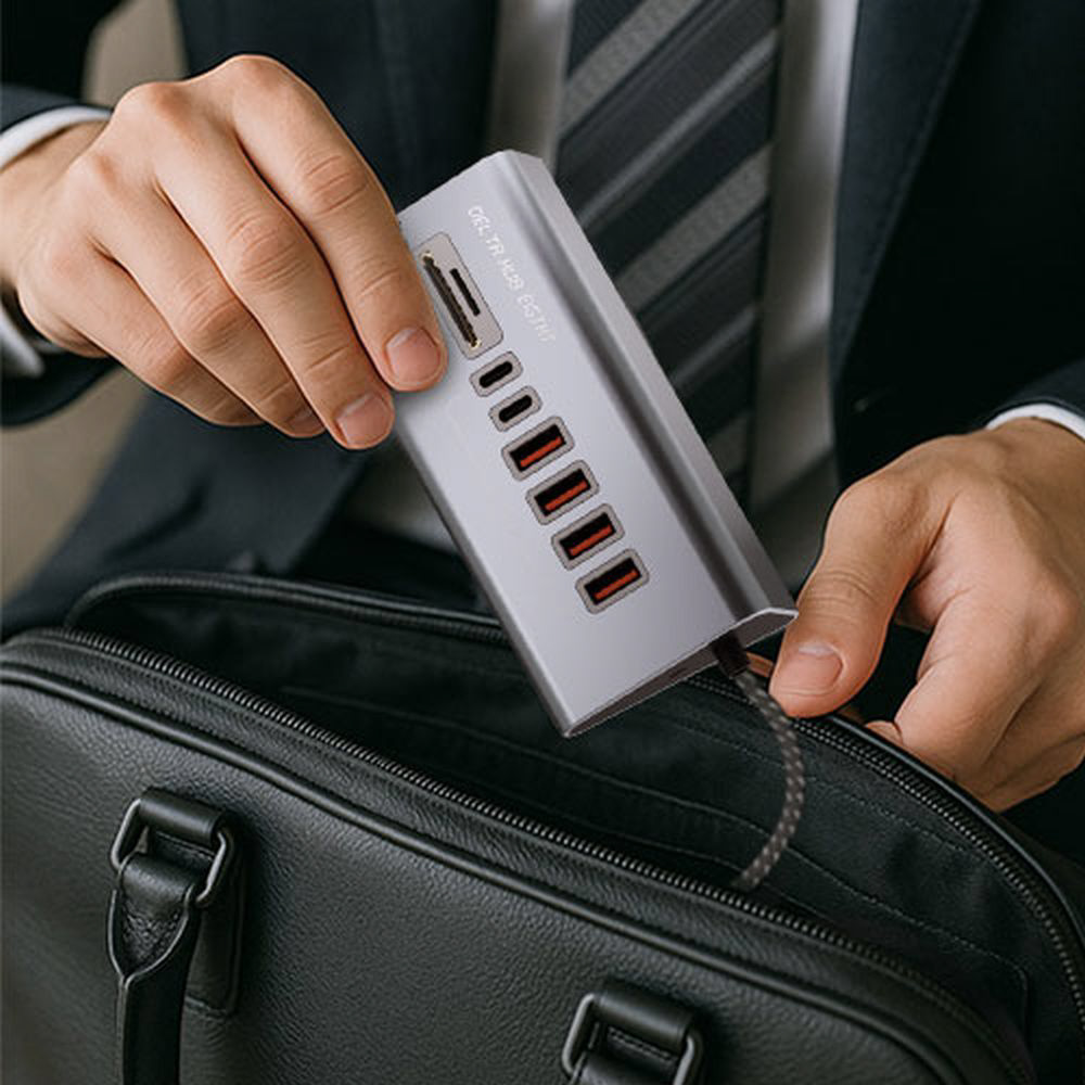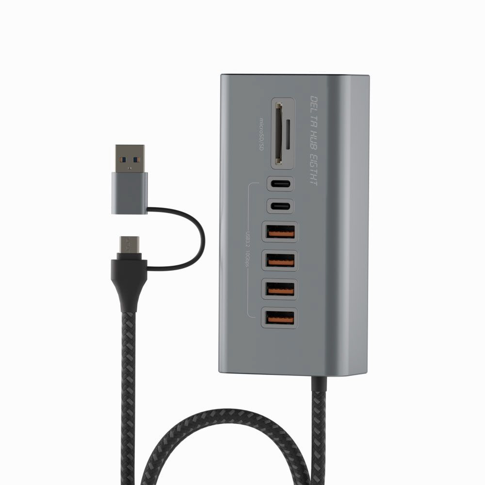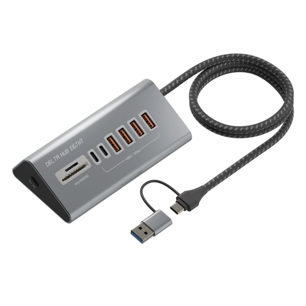 Type-C/Type-Aポート計6基とSD・MicroSDスロットを搭載し、周辺機器やメディアをまとめて接続可能。金属ボディとデルタ形状で操作性・耐久性も抜群。約1mのナイロン編みケーブルでデスク周りをスマートに整理します。