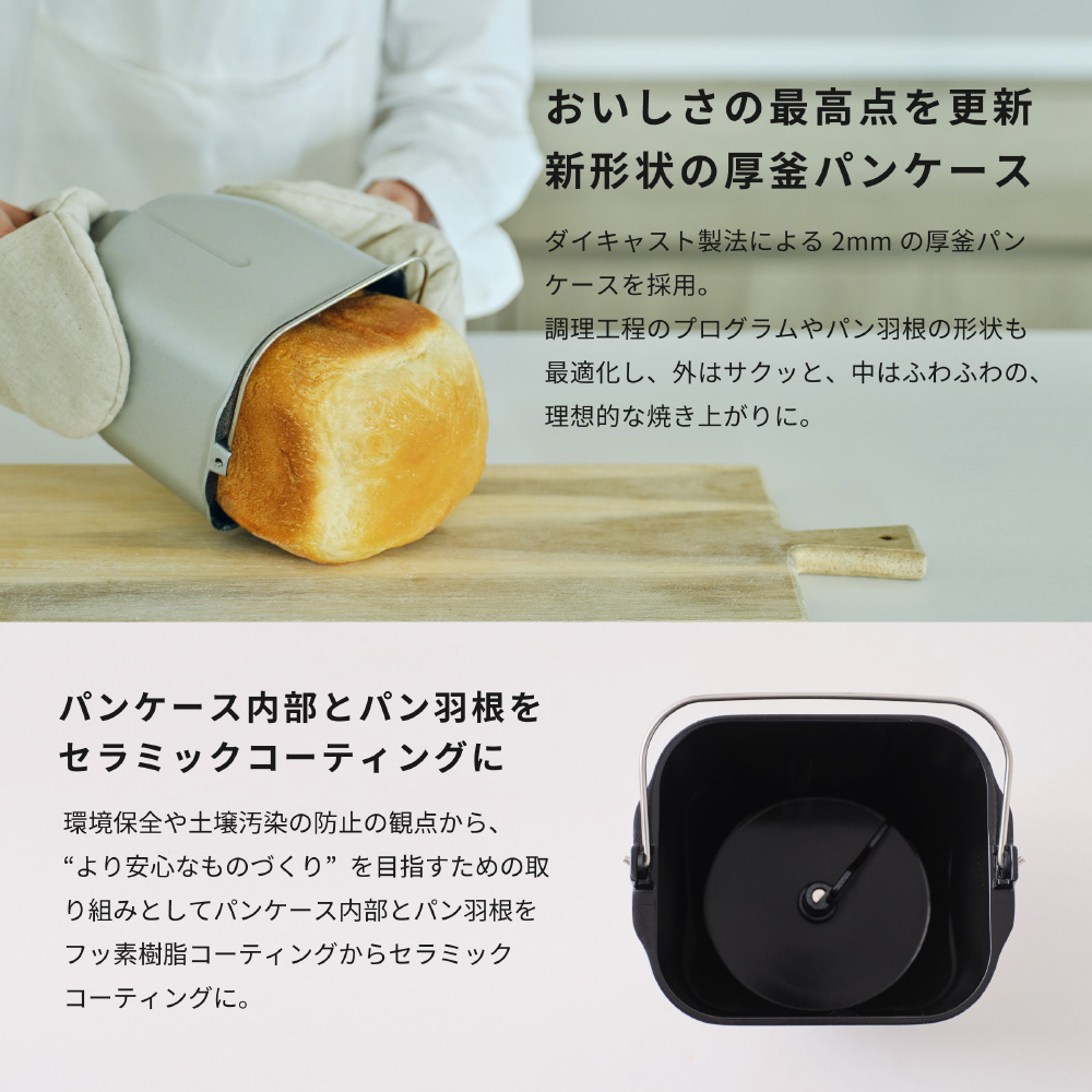 パンケースはセラミックコーティングを採用、環境や健康に配慮した「脱フッ素化」を実現。高加水パンやベーグル生地も手軽に作れる。