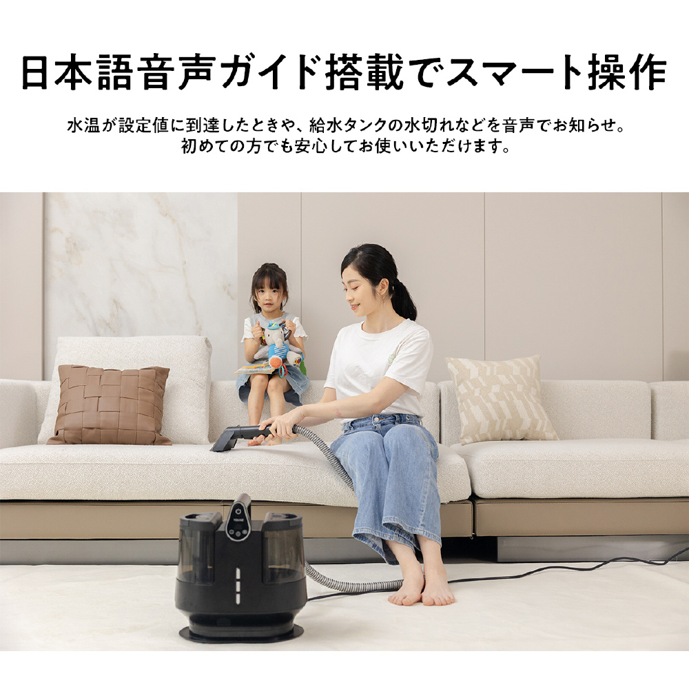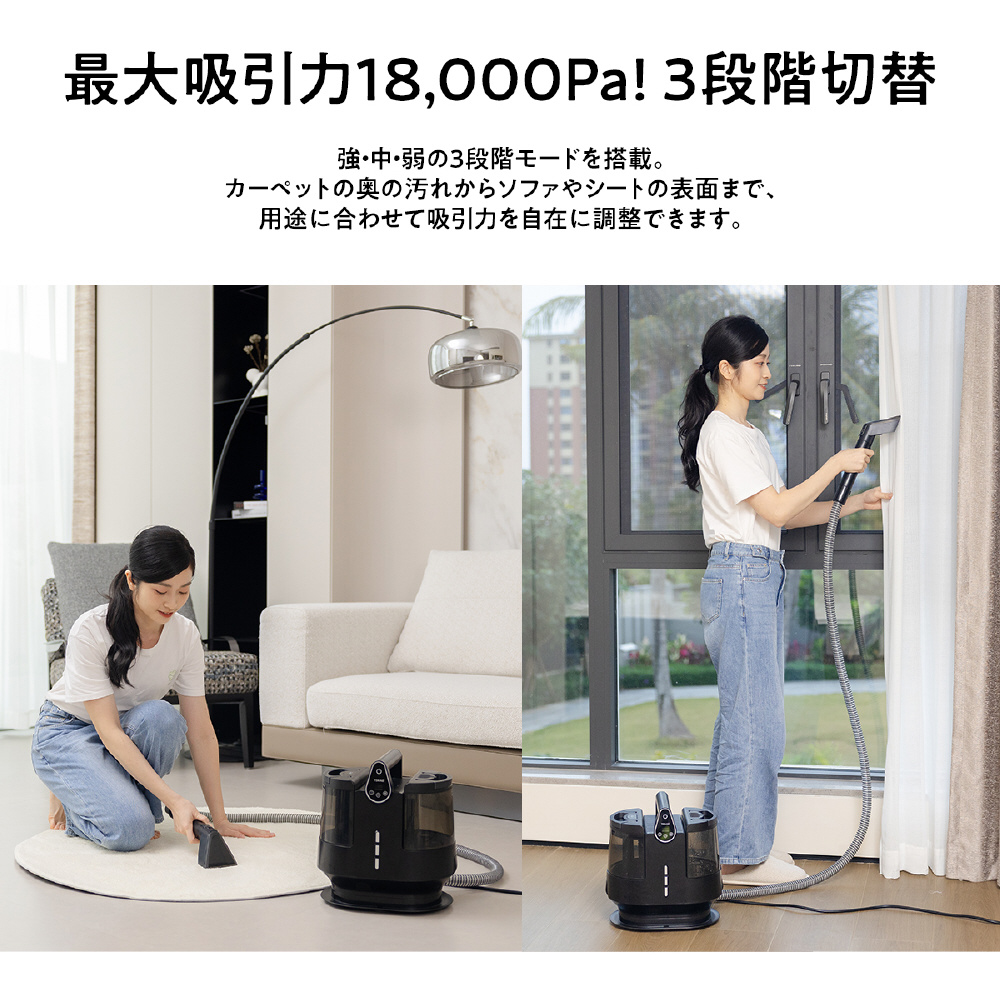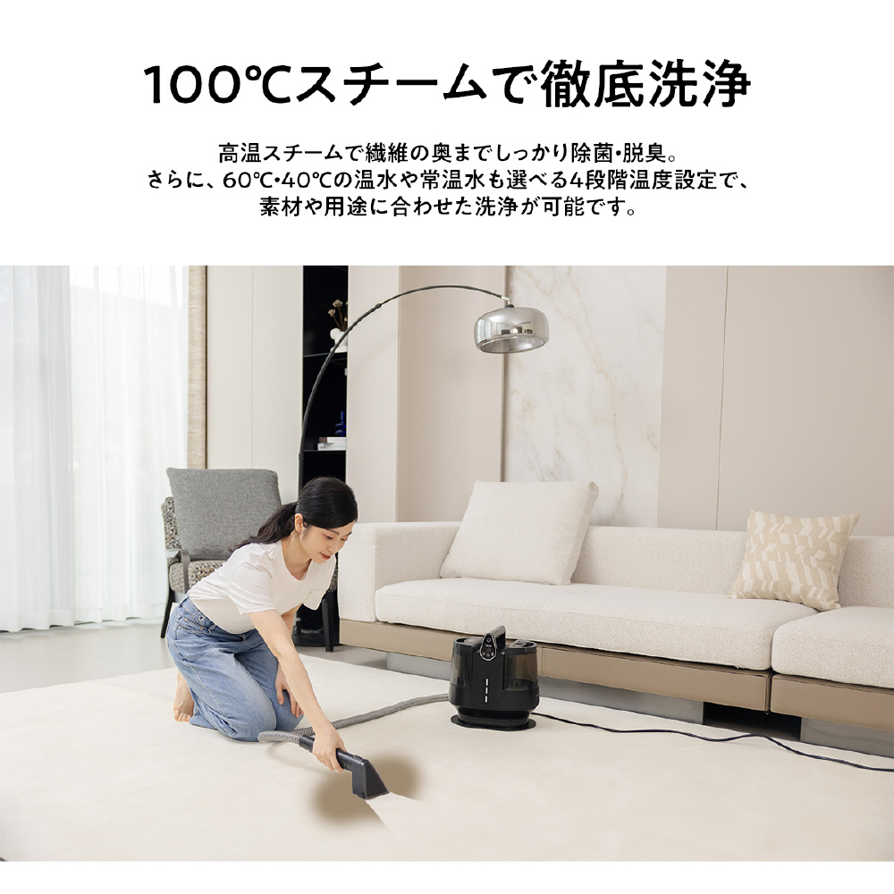100℃スチームで汚れを浮かせ、最大18,000Paの強力吸引でしっかり回収。温度4段階×吸引力3段階調整、日本語音声ガイド搭載で、布製品を手軽に清潔ケア。洗浄も吸引も、これ一台。