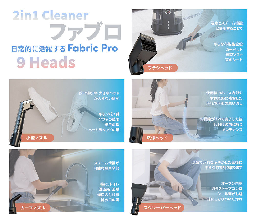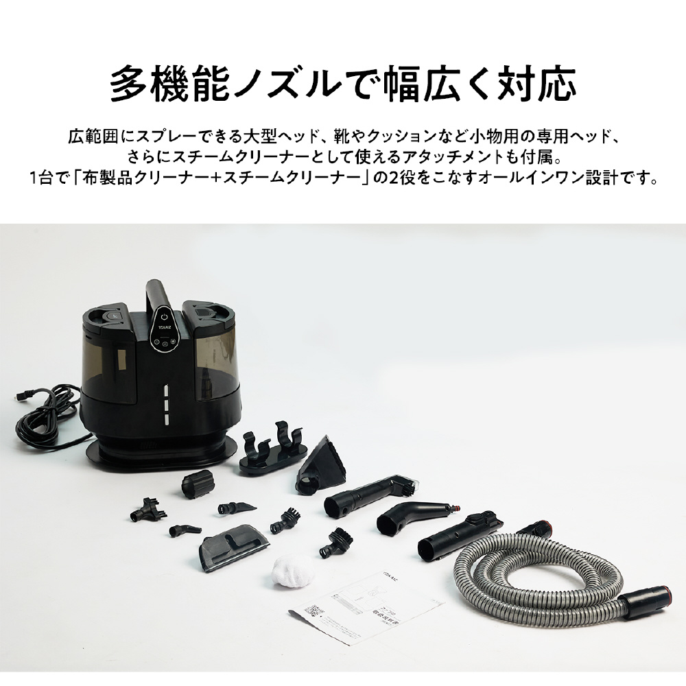 広範囲にスプレーできる大型ヘッドに加え、靴やクッションなど小物用の専用ヘッドも付属。さらにスチームクリーナーとして使えるアタッチメントも備え、1台で「布製品クリーナー+スチームクリーナー」の2役をこなすオールインワン設計です。