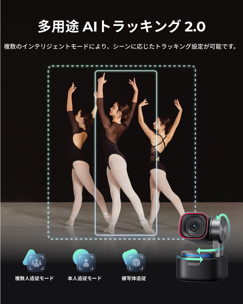【AIトラッキング 2.0】進化したAIトラッキングにより、人物はもちろん、グループや200種類以上の被写体を認識・追尾できる次世代のWebカメラ AIです。複数のインテリジェント追尾モードを備え、あらゆるシーンで理想的なフレーミングを自動でキープします。