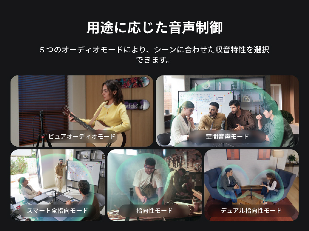 【トリプルマイク搭載、プロレベルの音質】OBSBOT web カメラには全体の音を捉える全指向性マイクに加え、声を正確に拾う2基のMEMS指向性マイクを搭載。5種類の専用オーディオモードにより、強力なノイズ低減とクリアな音声を実現し、環境に応じて最適な音質へ自動適応します。