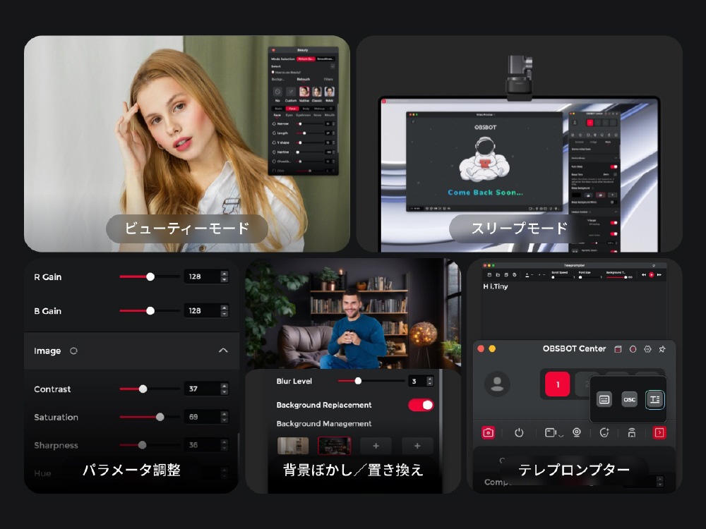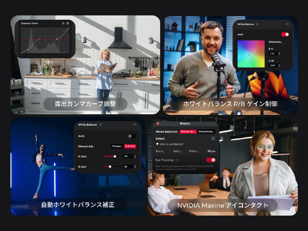 【OBSBOT Center ― すべてをコントロール】美顔、背景ぼかし、テレプロンプターなどの基本機能から、露出ガンマカーブ調整、ホワイトバランス補正、NVIDIA Maxine アイコンタクトといった高度な設定まで対応。さらに、リモート操作(RTC)やVRアバターなど、次世代技術にも対応した拡張性の高い専用ソフトウェアです。