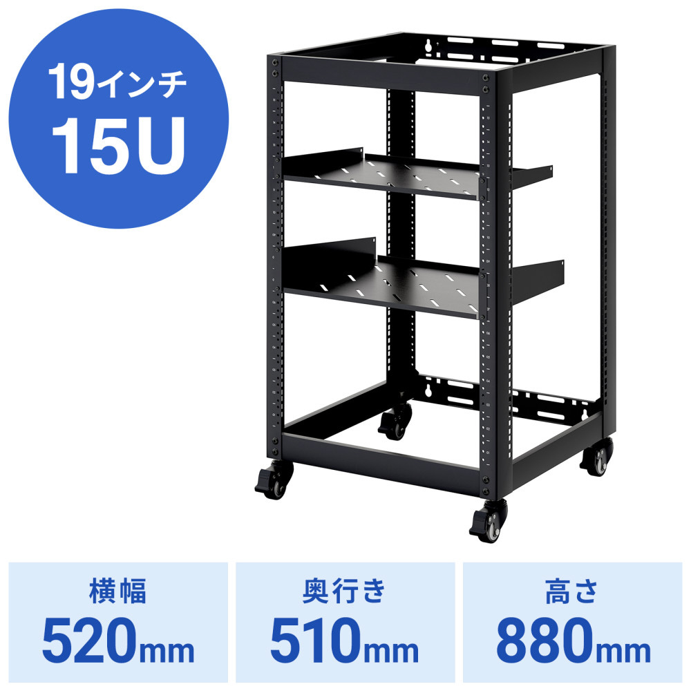 ネットワークラックキャビネット 15U [W520xD510xH880mm] 19インチマウントラック 耐荷重50kg キャスター/壁面設置対応 EIA規格 音響/検査機器対応 CP-NWR15UBK