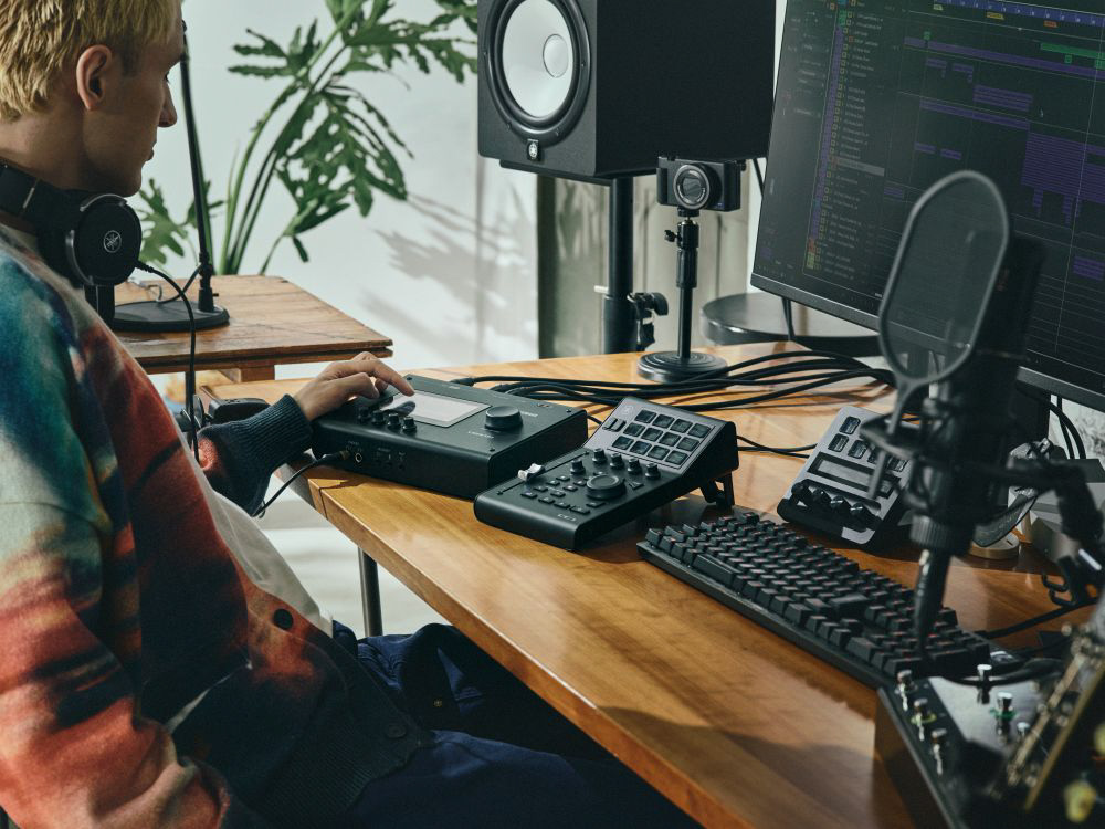 4 イン / 2 アウト USB-C オーディオインターフェース。32bit/192kHz 対応、タッチ LCD パネル GUI と物理コントローラー、DSP ミキシング/エフェクトにより、途切れのないワークフローを実現。