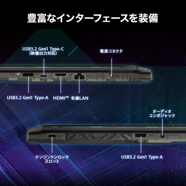 有線LAN 1Gbps ×1、USB3.2 Gen1 Type-C(映像出力対応)×1、USB3.2 Gen1 Type-A ×2、HDMI ×1、オーディオコンボジャック ×1