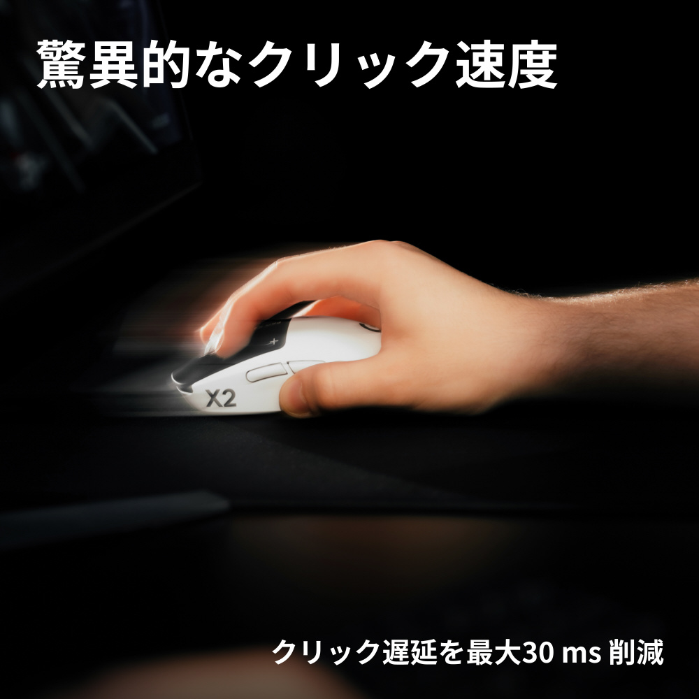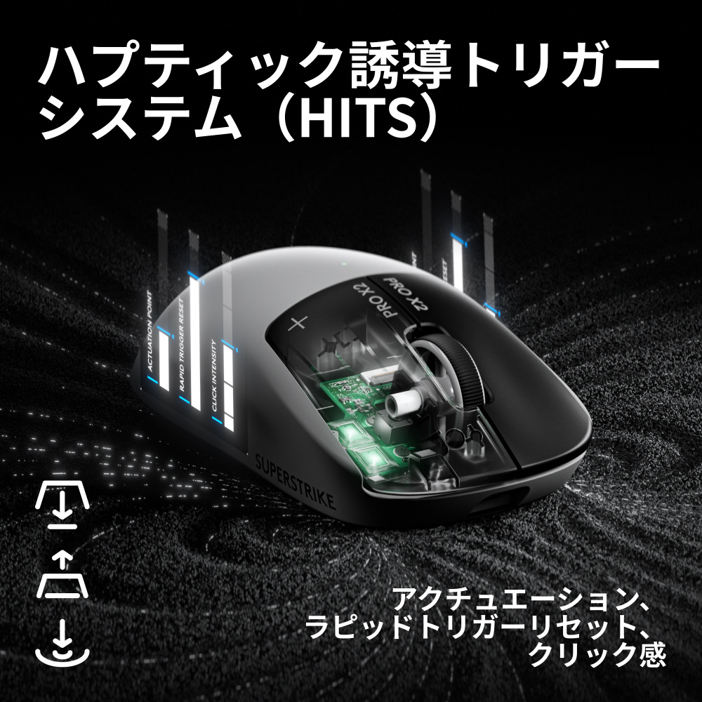 本製品は、世界のeスポーツ選手との共同開発で生まれた、世界初※1のハプティック誘導トリガーシステム(HITS)をクリックボタンに搭載しています。「PRO X2 SUPERSTRIKE」は、左右のマウスクリックの部分に押下量を連続的かつ即座に検知する誘導システムを採用することで、クリック入力が従来より最大30ミリ秒高速化しました。これにより、勝敗を分ける一瞬の操作に高いレスポンスをもたらします。
