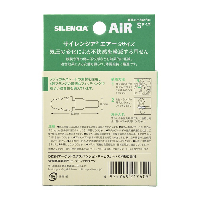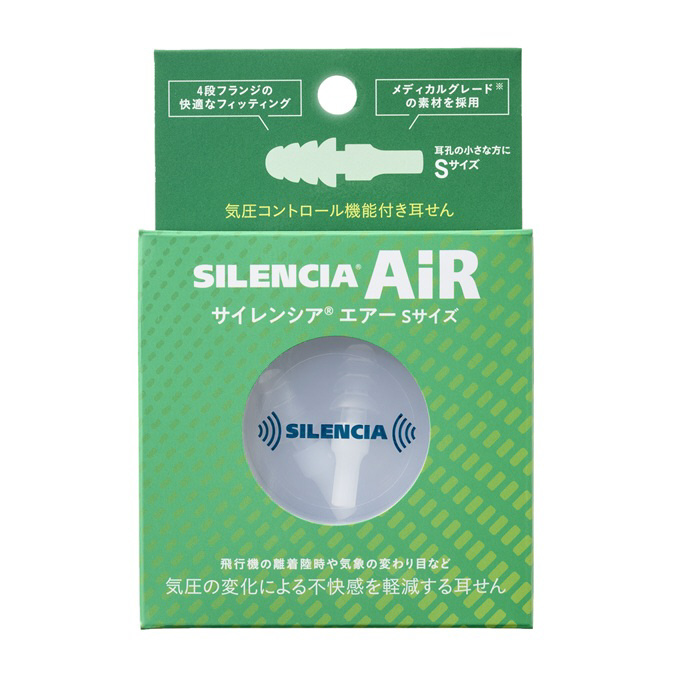 飛行機の離着陸時の不快な耳の痛みを軽減する耳せんサイレンシア フライト・エアー。耳が小さい方向けのSサイズ。