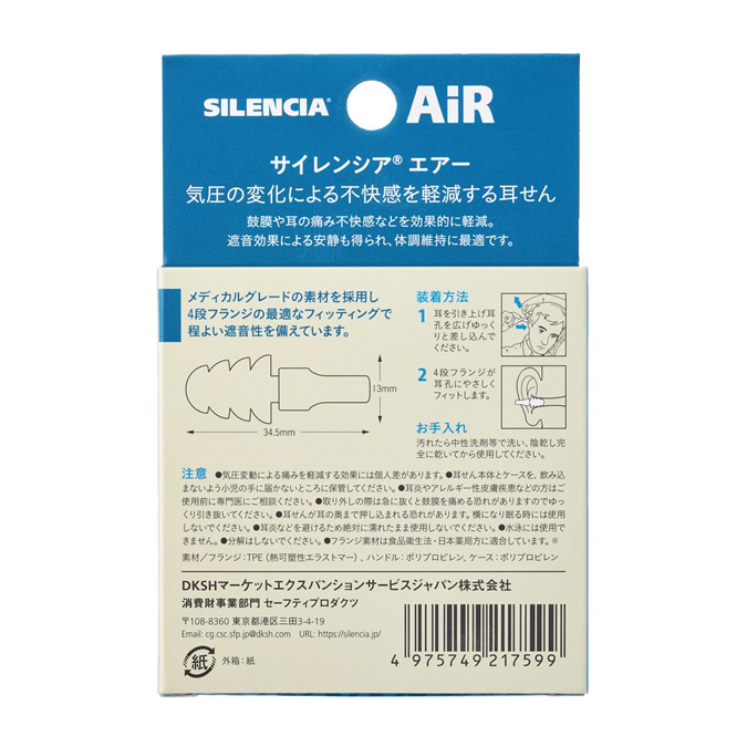 飛行機の離着陸時の不快な耳の痛みを軽減する耳せんサイレンシア フライト・エアー
