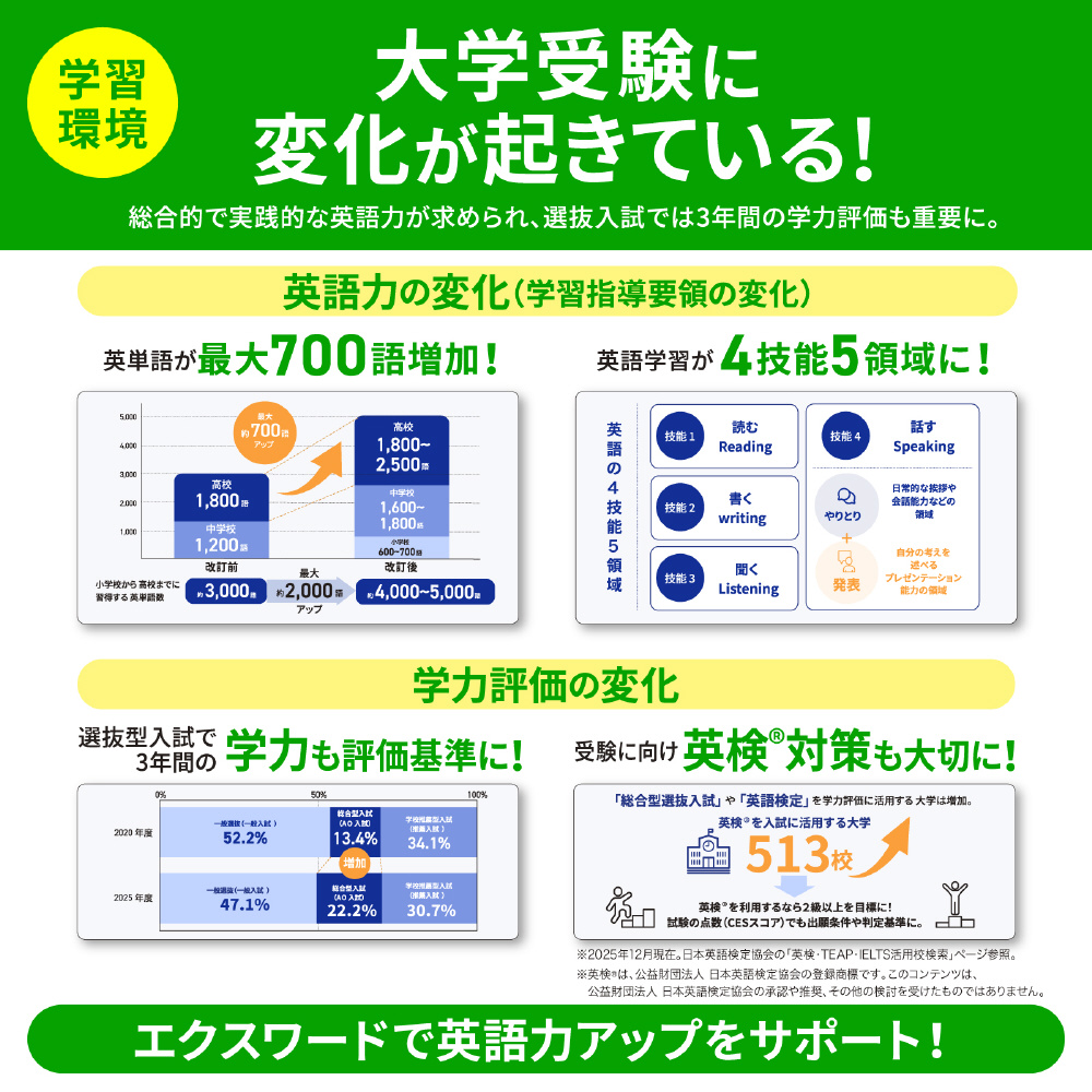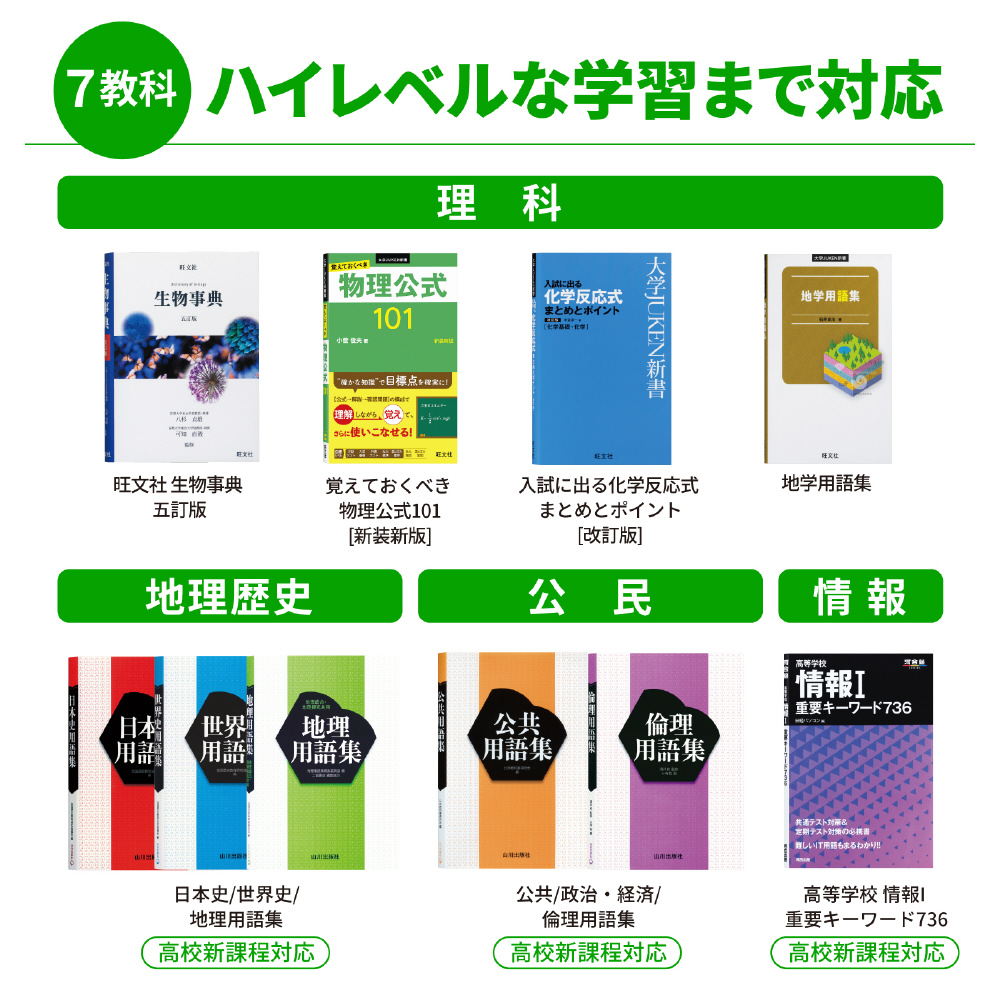さらなる高みを目指す高校生へ。ハイレベルな英語学習、難関大学合格に向けた高校学習をサポート。 読む、聞く、書く、話すの7技能をバランスよく学習できる英語系コンテンツをはじめ、用語集、参考書、問題集などを幅広く収録。授業の予習・復習から受験まで活用できます。