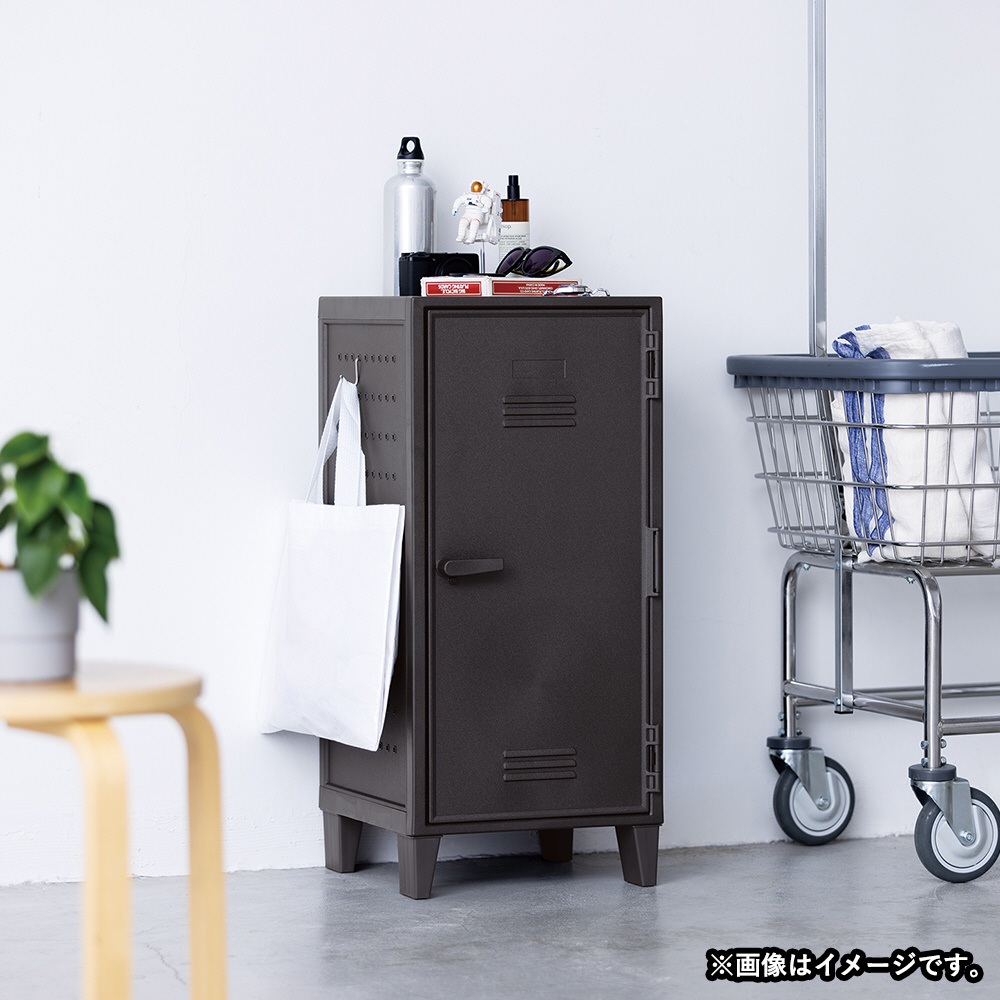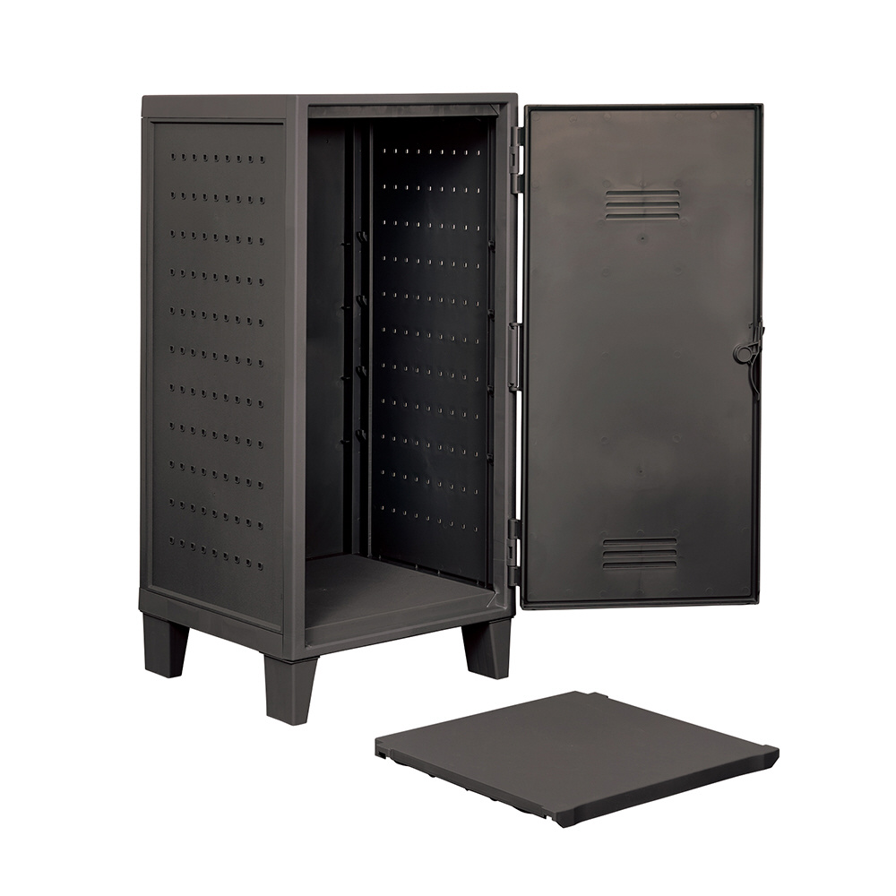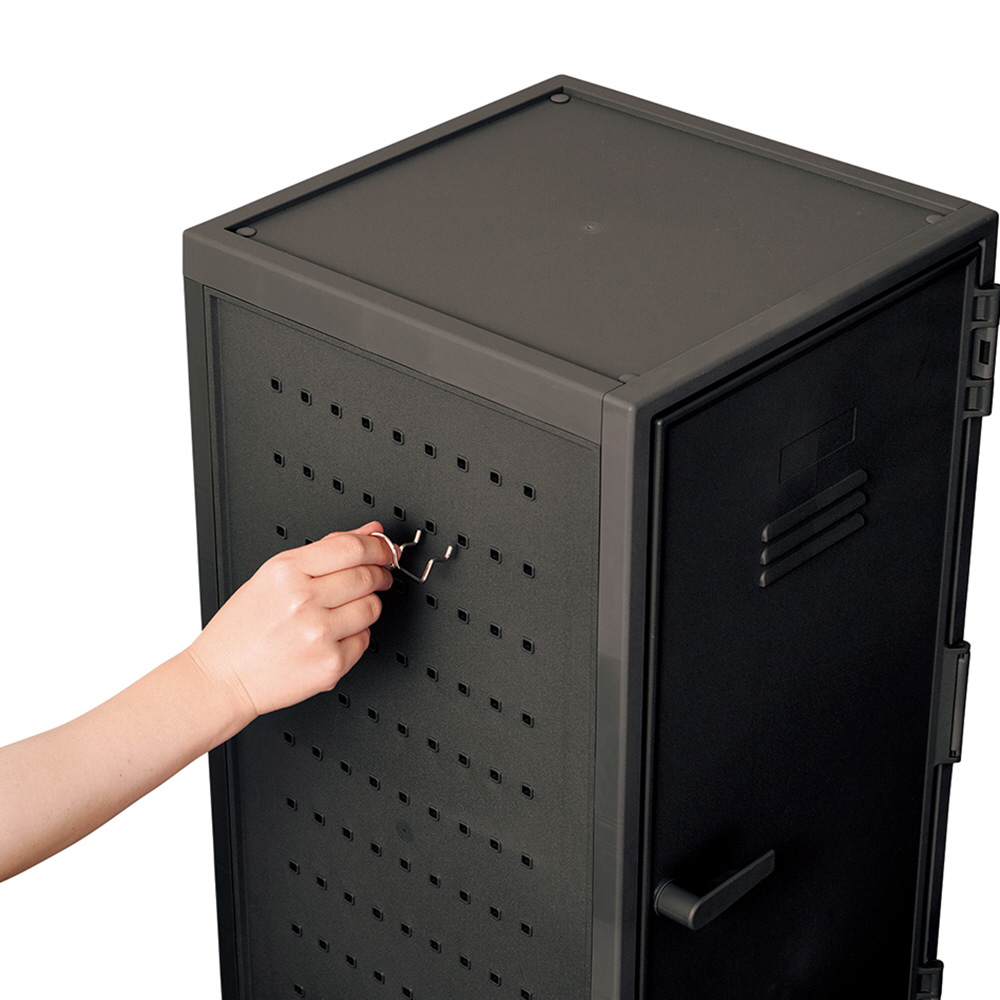 自由にアレンジできる側面にペグボードが付いたプラスチック製のロッカー型収納ケースです。
