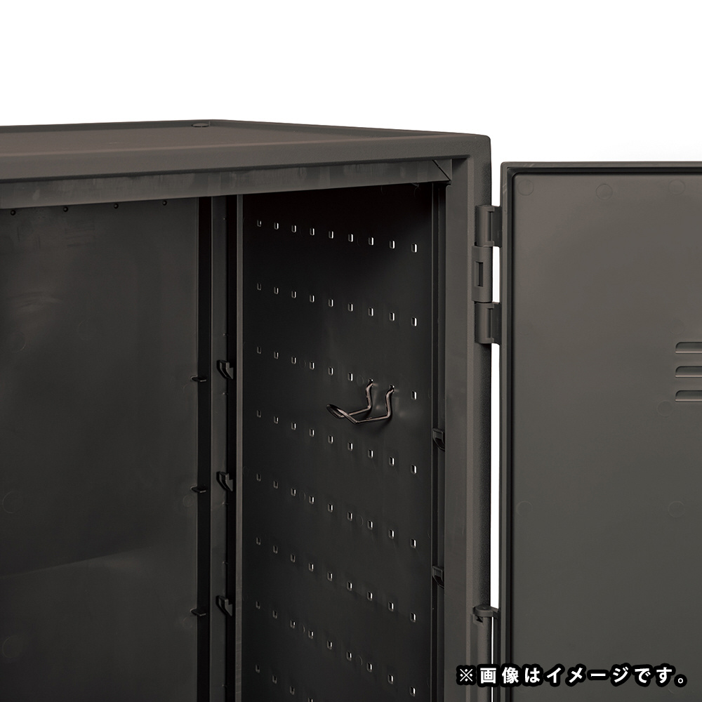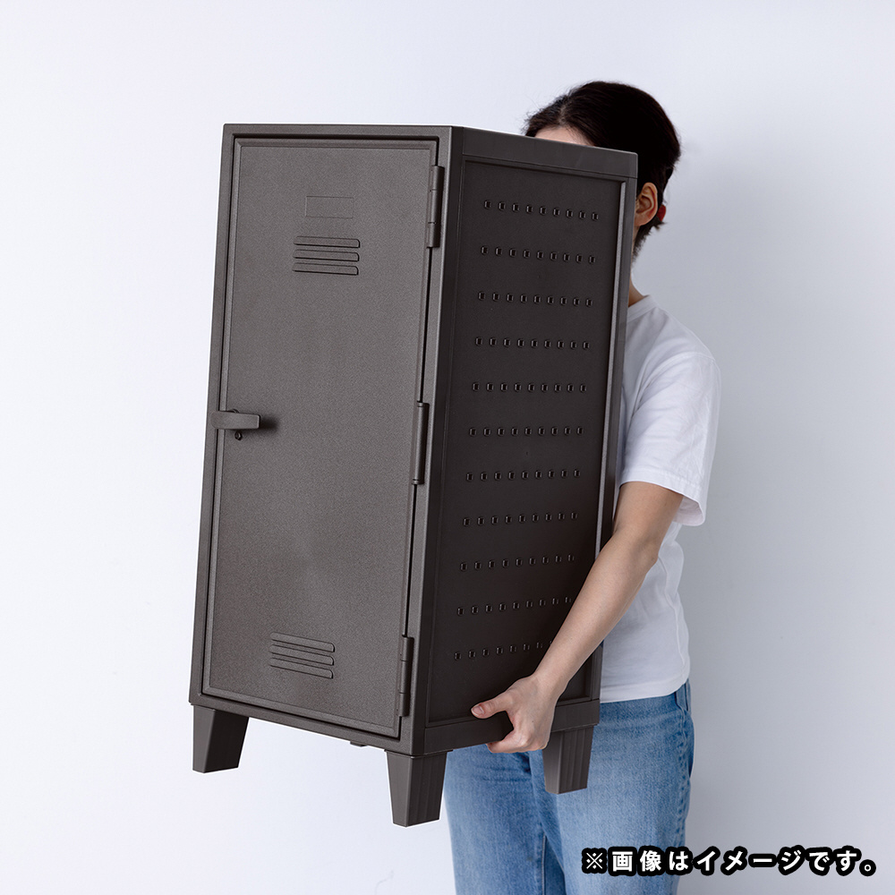 自由にアレンジできる側面にペグボードが付いたプラスチック製のロッカー型収納ケースです。