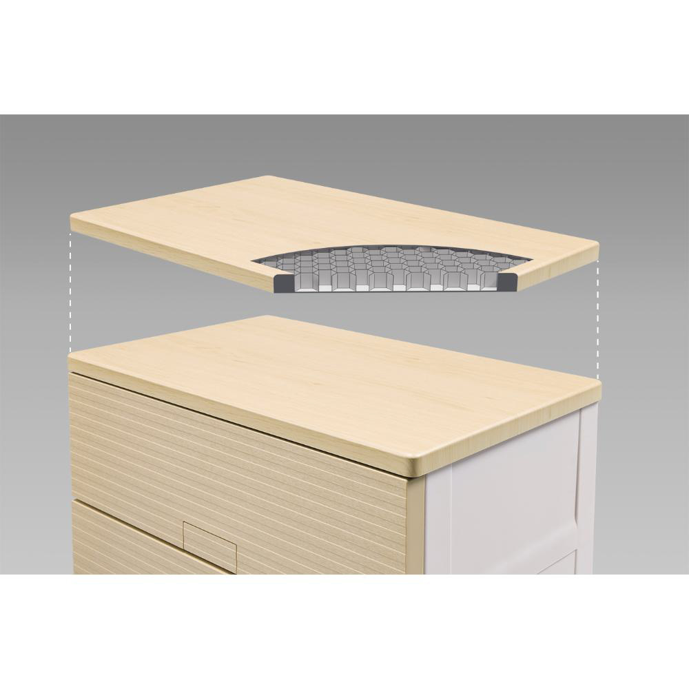 木製天板には、蜂の巣のように同じ大きさの六角形を敷き詰めた「ハニカム構造」を採用。軽くて丈夫な造りになっており、角が丸く加工されているので安心してお使いいただけます。