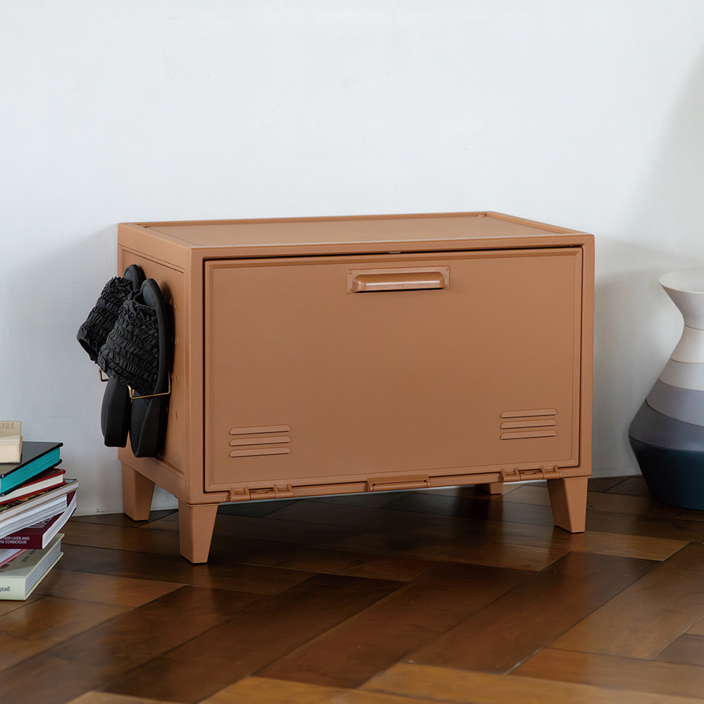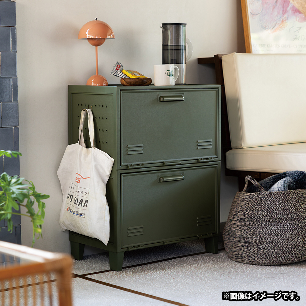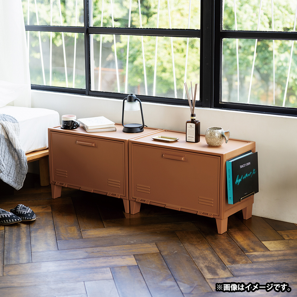 自由にアレンジできる側面にペグボードが付いたプラスチック製のロッカー型収納ケースです。