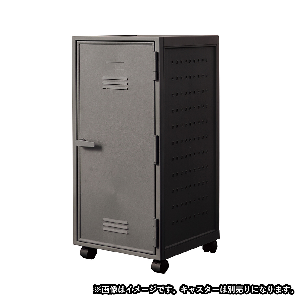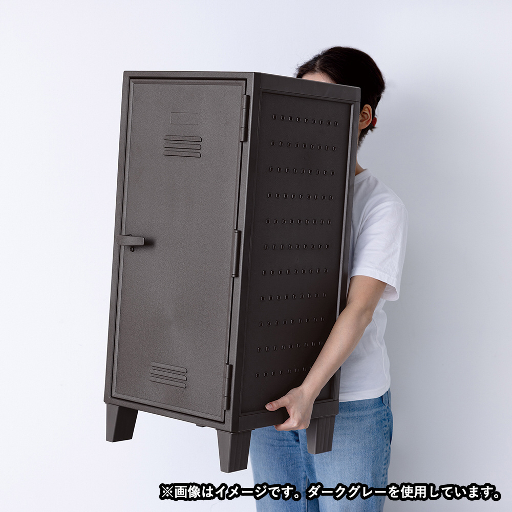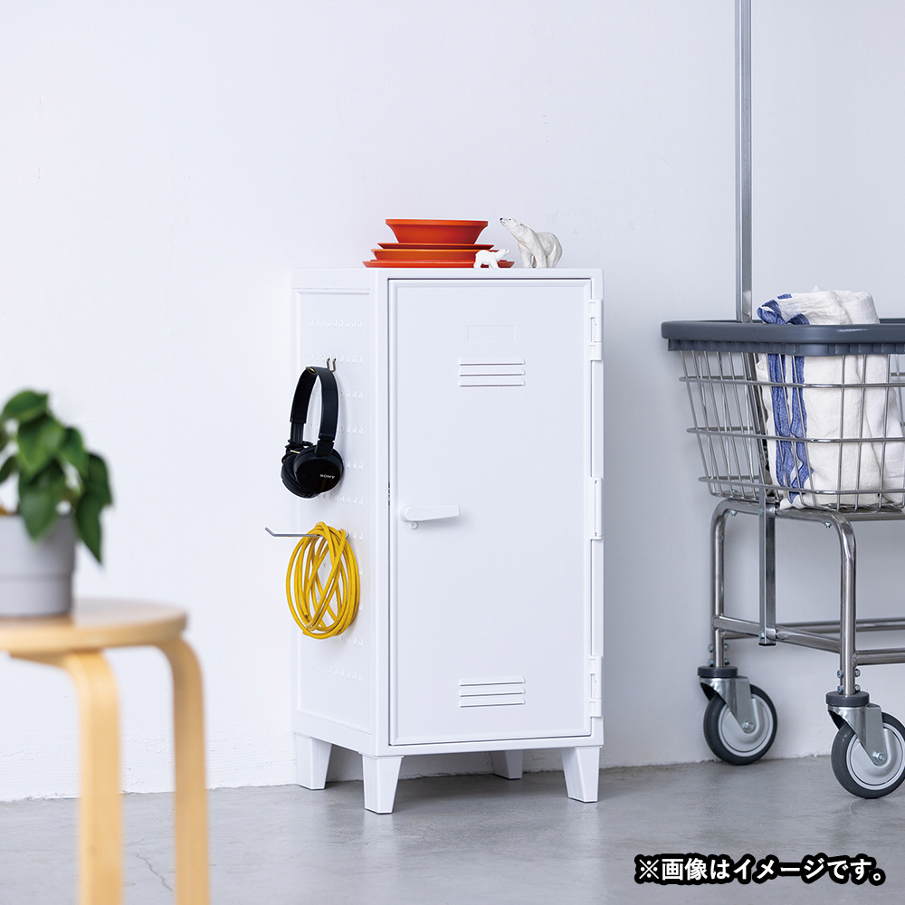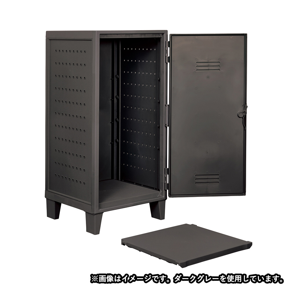 自由にアレンジできる側面にペグボードが付いたプラスチック製のロッカー型収納ケースです。