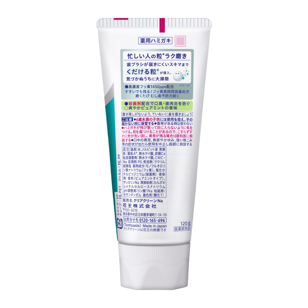 忙しい人の粒*ラク磨き。歯ブラシが届きにくいスキマまでくだける粒*が侵入、気づかぬうちに大掃除!・高濃度フッ素1450ppm配合/すすいでも残る!フッ素長時間吸着処方/磨くたびむし歯予防力続く・殺菌剤(塩化セチルピリジニウム)配合で口臭、歯肉炎を防ぐ。爽やかピュアミントの香味(医薬部外品)*清掃剤顆粒A