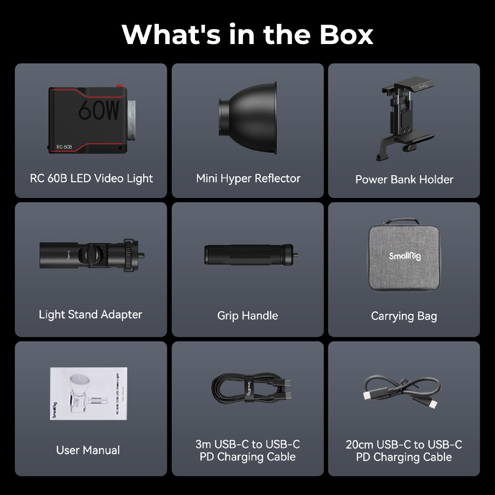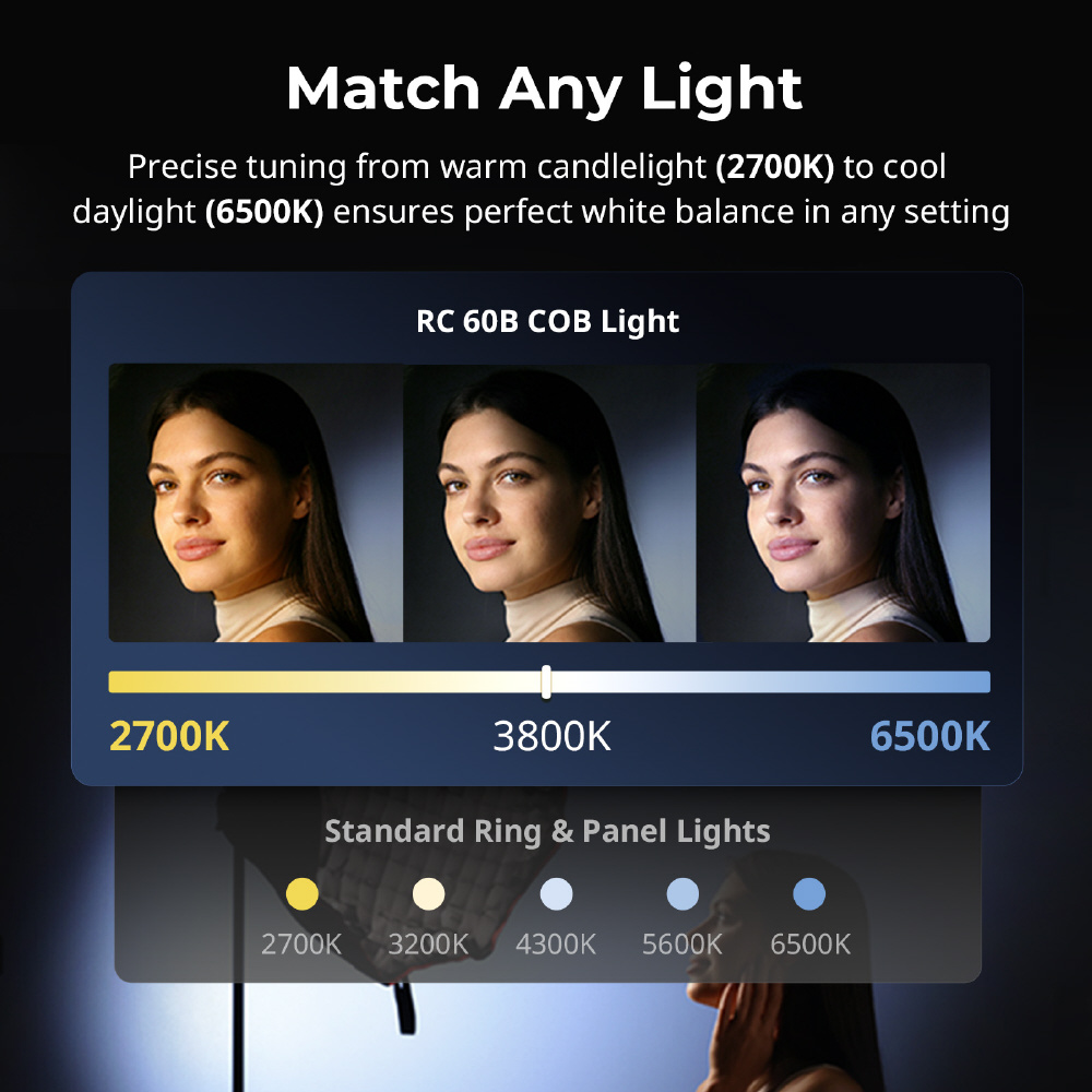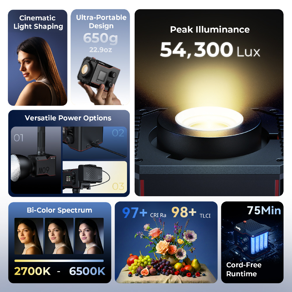 SmallRig4376B RC 60B COB LEDビデオライト バッテリー内蔵 コンパクト 二色色温度 2700K-6500K 高演色 CRI 97+ TLCI 98+ TM-30 Rg 100 TM-30 Rf 96 放熱よし 静音 9種類の照明効果 常定光 昼光バランス 撮影用