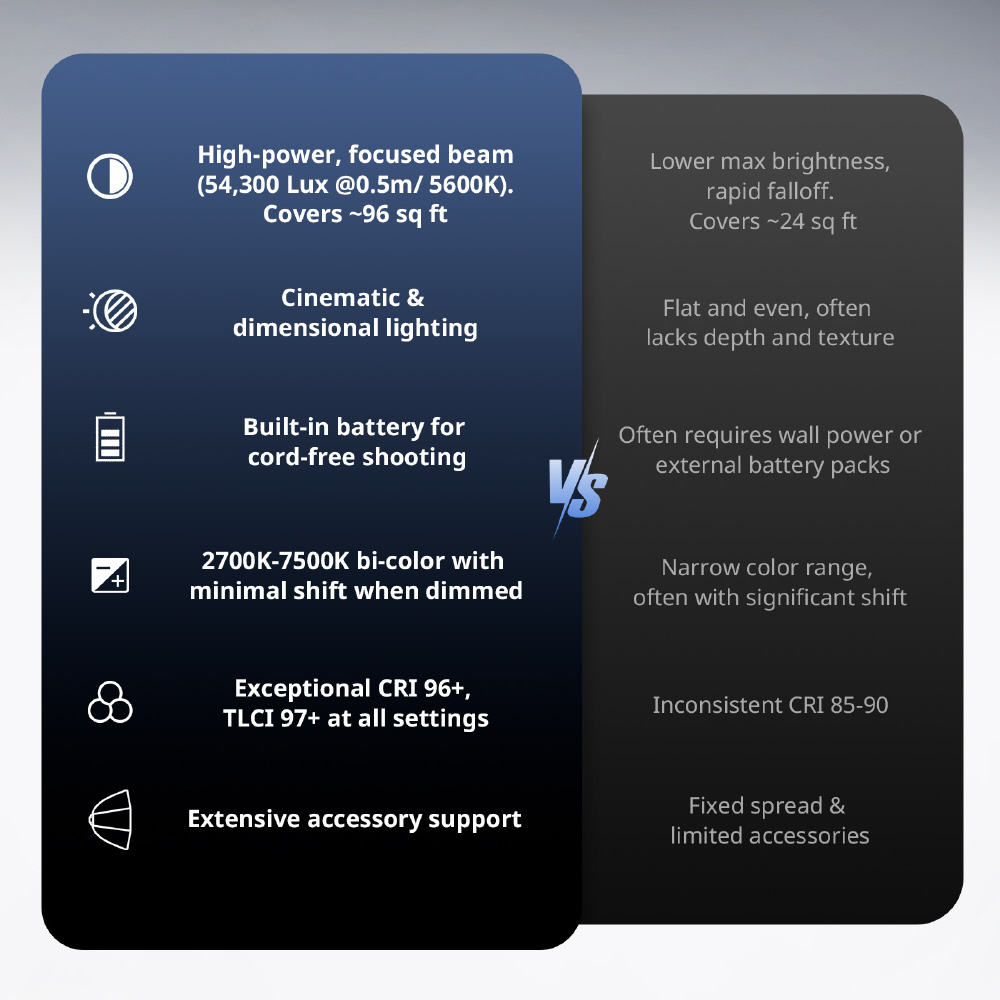 【超高演色評価数と9つの光効果】CRI 97+、TLCI 98+、SSI平均89、TM-30 Rf/Rgはそれぞれ96/100に達し、オブジェクトの色を真に復元できます。 色温度範囲は2700K?6500K。 1m/5600K以下で、裸ライトの照度は2670ルクス、標準カバーを使用した場合の照度は11200ルクスです。 パパラッチ、花火、稲妻、壊れた電球、テレビ、パーティー、炎、呼吸、ちらつきなど、9 つの内蔵照明効果。