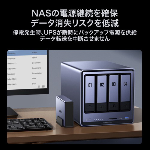 UGREEN NAS 120W DC 無停電電源装置(UPS)は、停電/瞬断発生時、遅延なく安定した電力供給に瞬時に切替をします。作業中のデータ書き込み中断リスクから守り、NASの安全なシャットダウンを保証します。また、データ破壊やハードディスク故障を防止します。