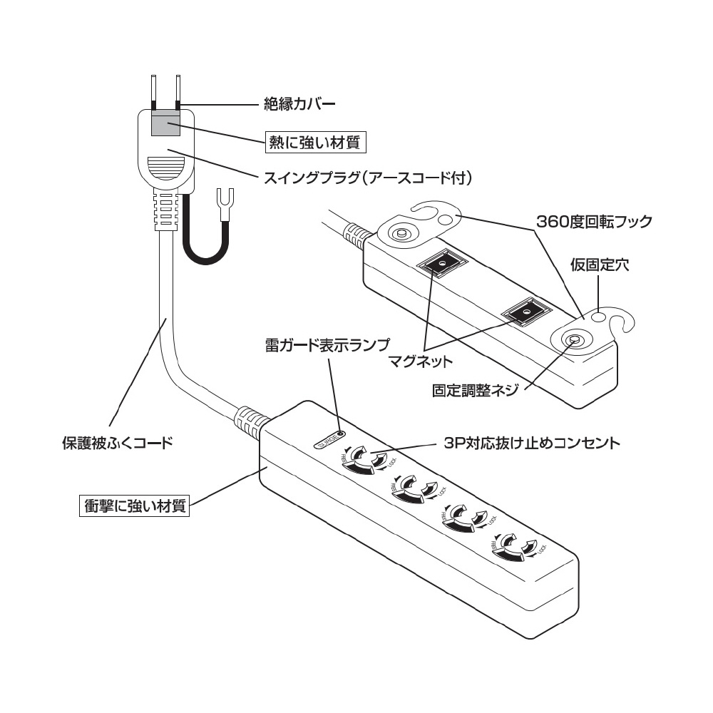 3P抜け止めマグネットフック付タップ4個口5m 白 H5HJKNP405WH 360°回転フック・強力マグネット・雷ガード機能付き 3Pプラグ対応 [5.0m /4個口 /スイッチ無]