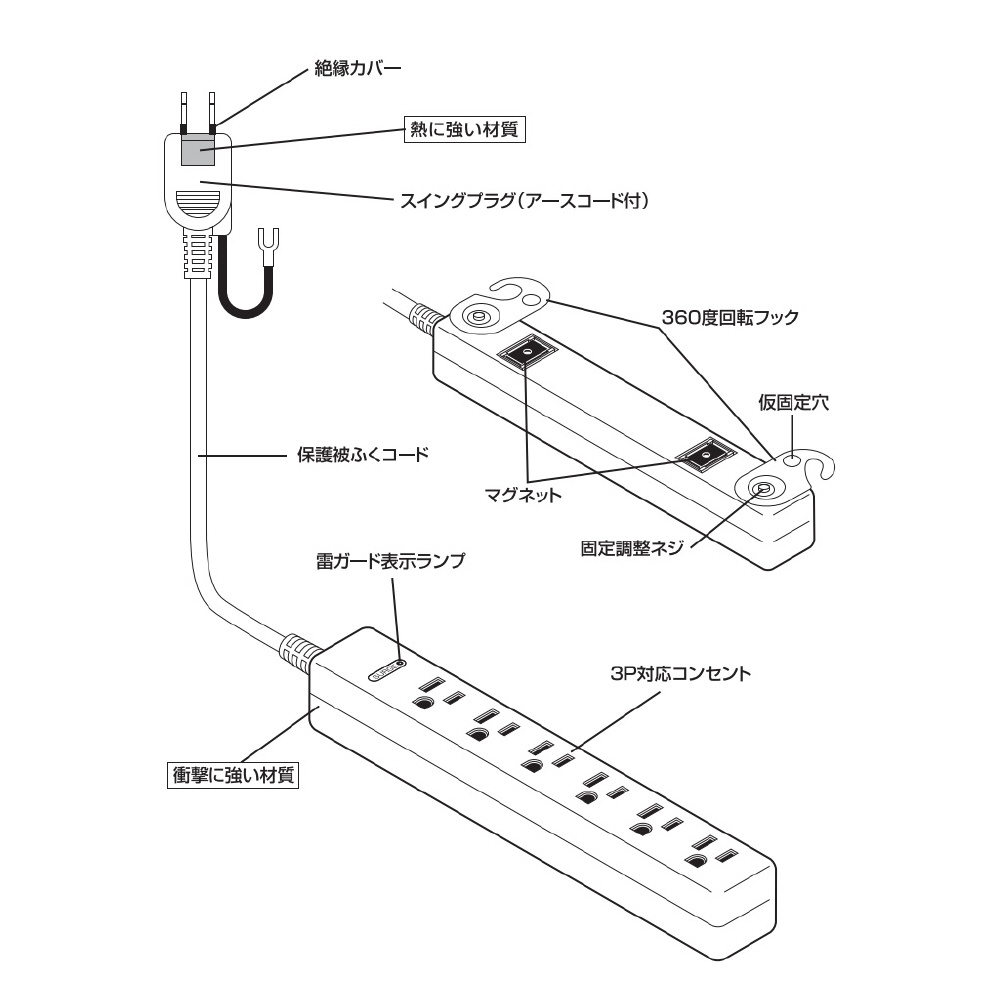 3Pマグネットフック付タップ6個口2m 白 H5HJKP602WH 360°回転フック・強力マグネット・雷ガード機能付き 3Pプラグ対応 [2.0m /6個口 /スイッチ無]
