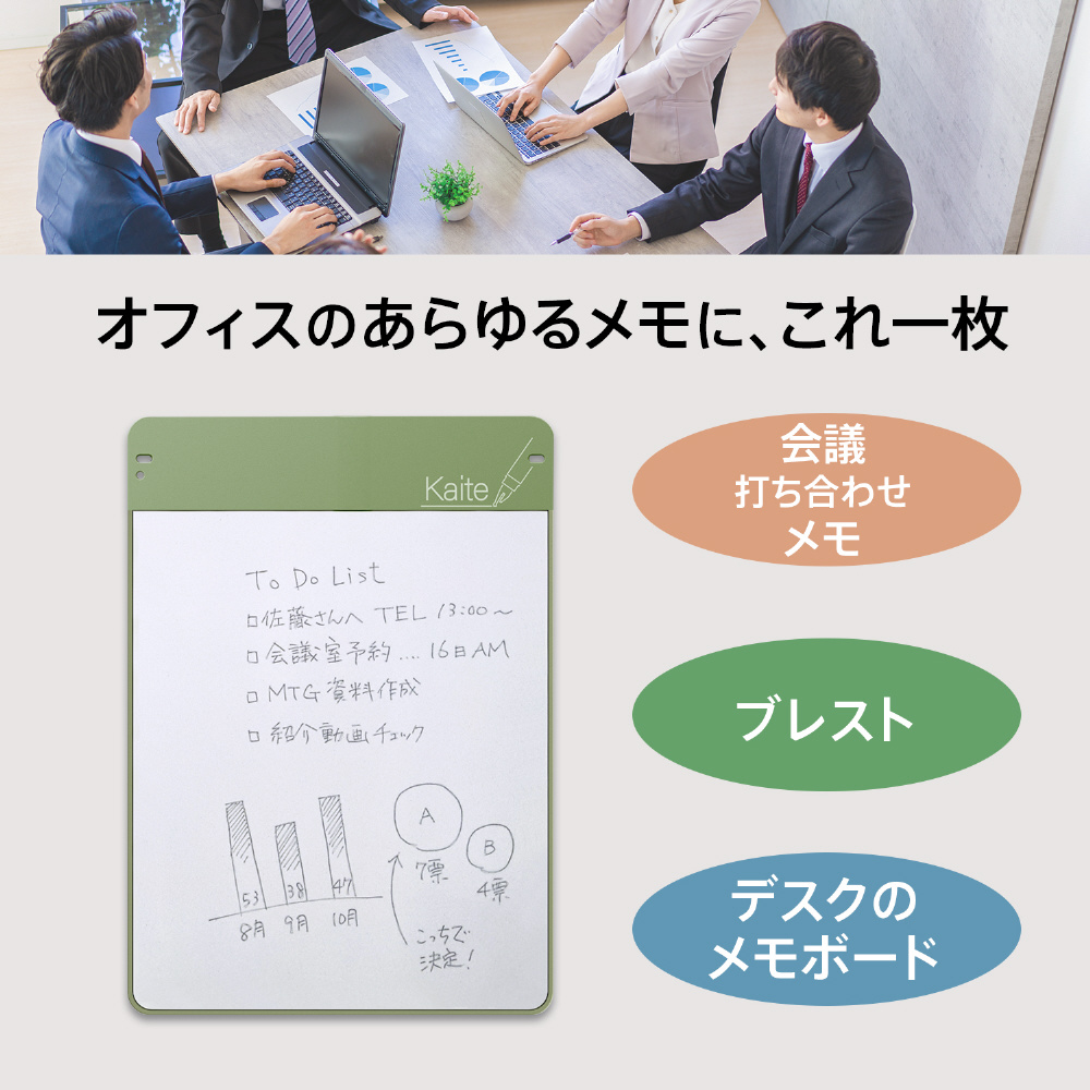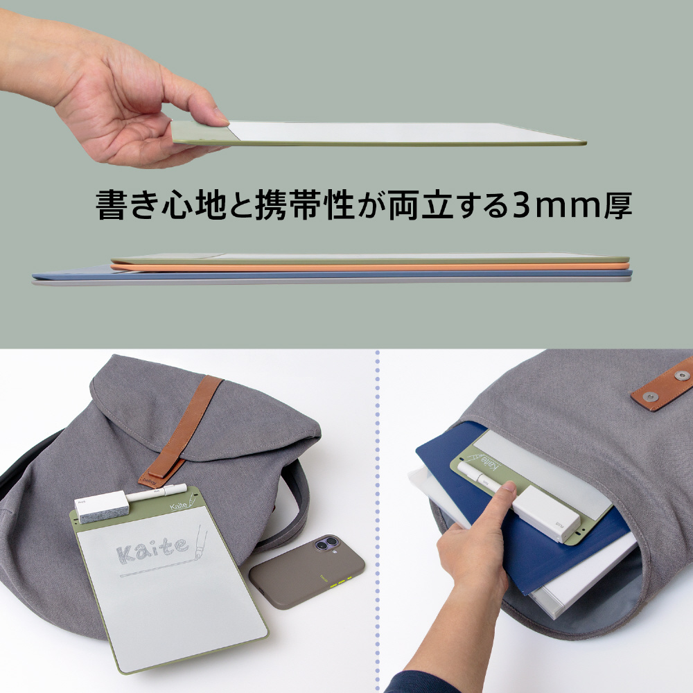 紙でも、電子でもない、新しい選択。必要なのはKaiteだけ。何度もくり返し、紙のようにスラスラ書き消しできるメモ、Kaite(カイテ)。