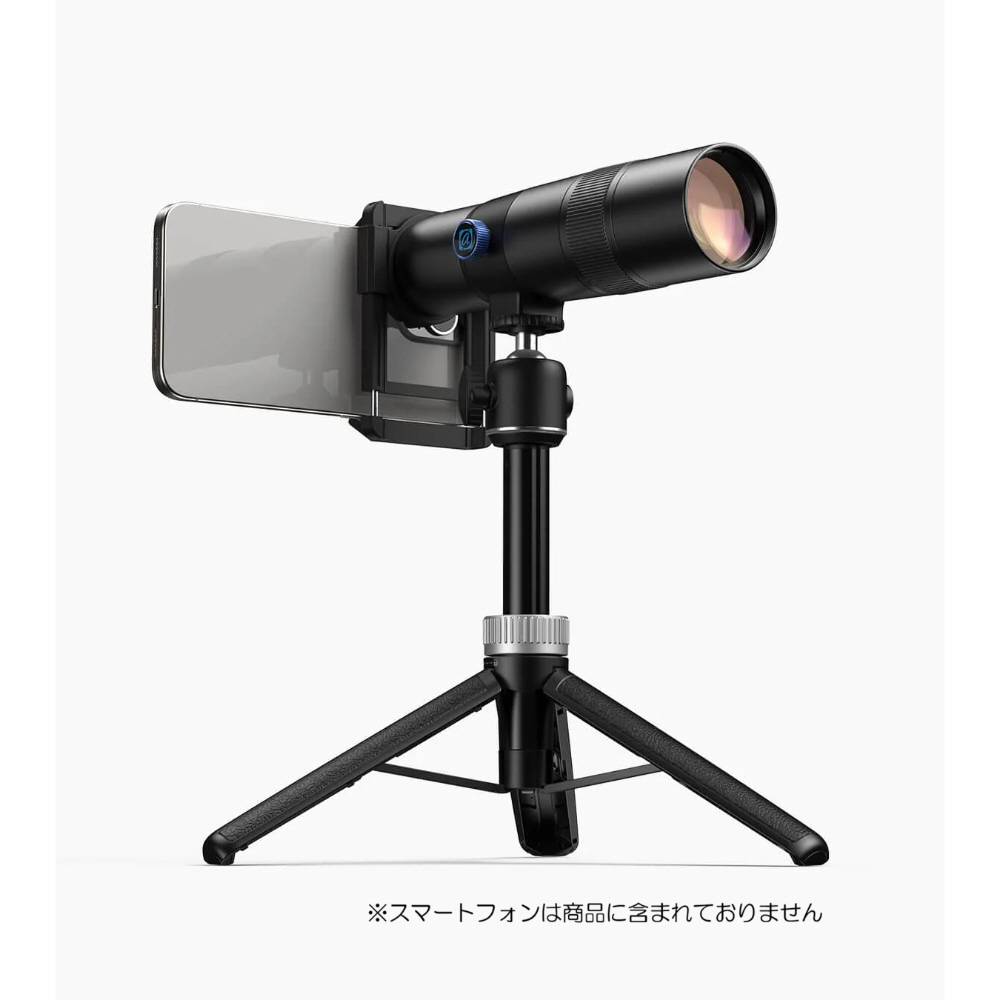 スマートフォンに取り付けて使用する30倍望遠レンズです。安定した撮影に役立つコンパクトな三脚が付属。また、付属のアイカップを取り付けて単眼鏡としても活用できます。