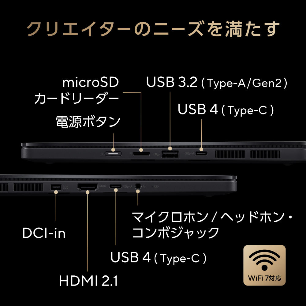 USB-A (USB3.2Gen2) x1 USB-C (USB4/Power Delivery対応) x2 ※ ※データ転送と映像出力、本機への給電をサポート。すべてのデバイスの動作を保証するものではありません。 HDMI 2.1 x1 microSDカードリーダー x1(microSDXC/microSDHC/microSDメモリーカード) マイクロホン/ヘッドホン・コンボジャック x1