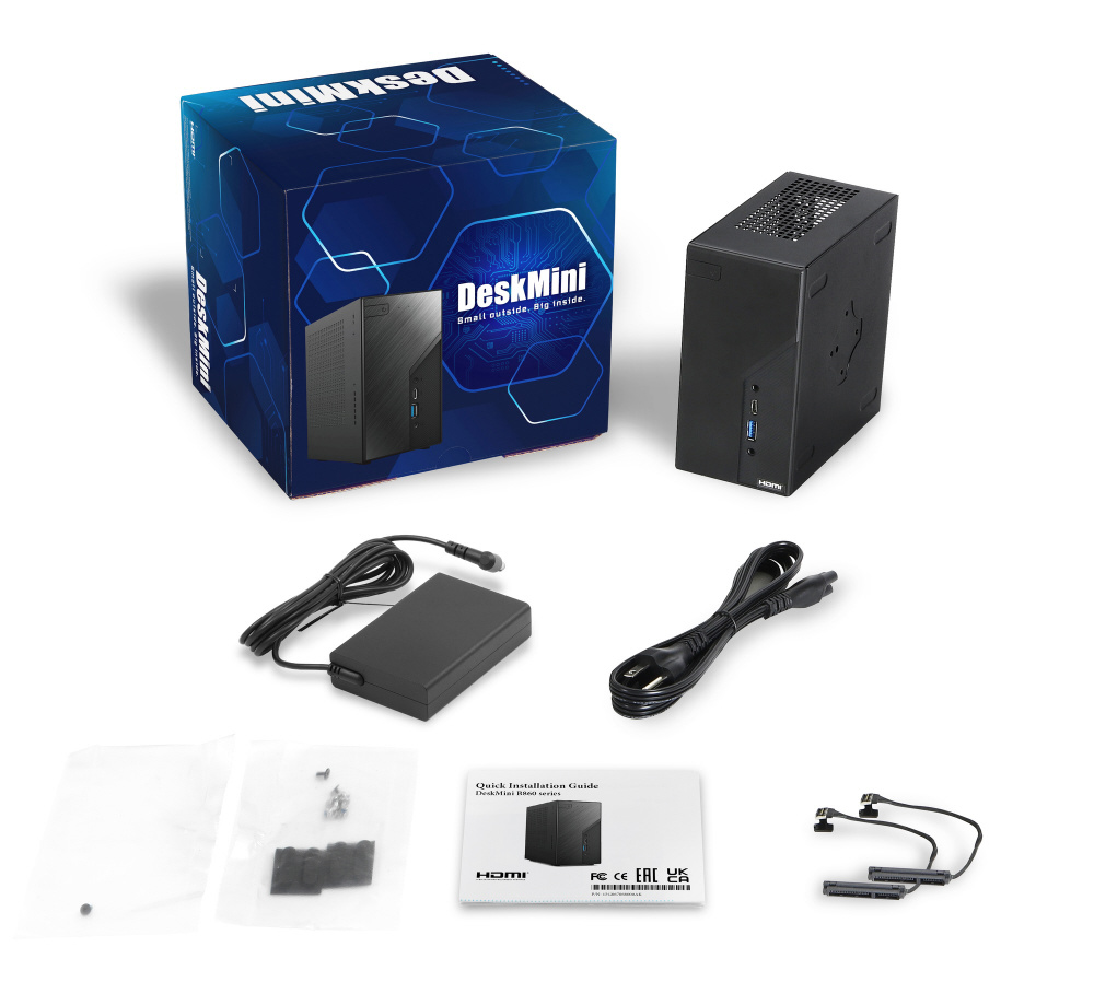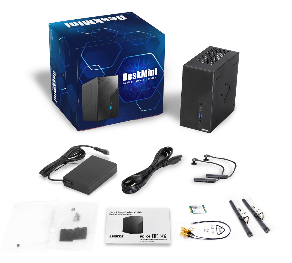 付属品 ACアダプター、SATAデータ&電源ケーブル、M.2ソケット用ネジ、Wi-Fiモジュール用ネジ