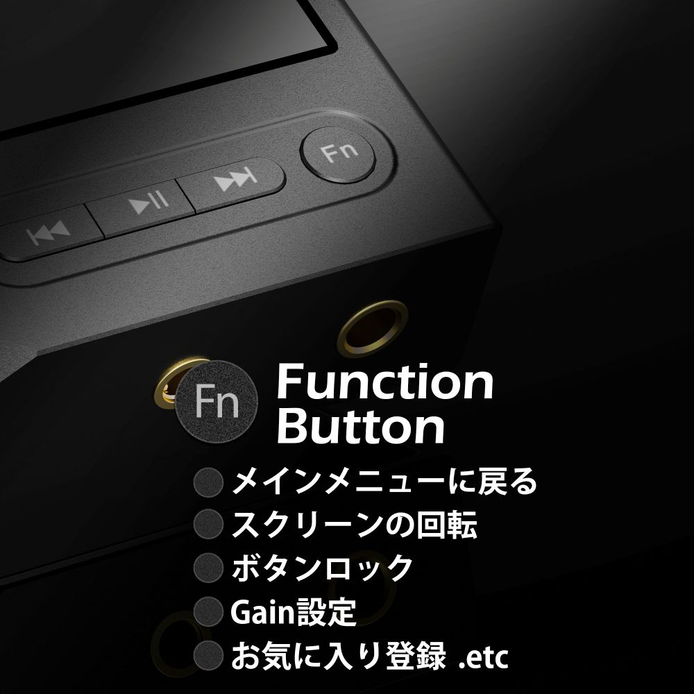 本体前面に備わった「Fn(ファンクション)ボタン」はカスタマイズに対応し、メインメニュー、スクリーン回転、ボタンロック、Gain機能、お気に入り登録などの操作をお好みで設定することが可能です。