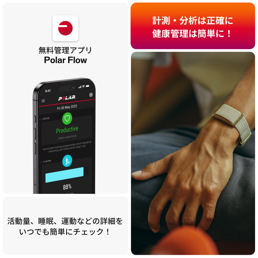 睡眠や活動量計測に特化した、ポラール初のヘルスケアバンド。画面のないリストバンド型で表示や通知を気にすることなく、自分の好きなタイミングで進捗をチェックできます。高精度心拍センサーを搭載。本体は軽量29.5gで就寝中も気にならずに計測可能。防水なので、家事やお風呂でも着用できます。