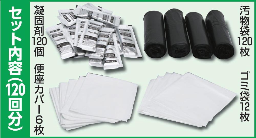 凝固剤240回分、汚物袋240枚、ゴミ袋24枚、便座カバー12枚