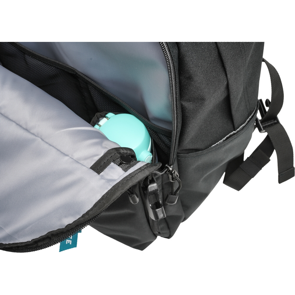 前側ルームにアクセスできる脇ファスナー内部には、固定ポケットつき。ボトル類や折り畳み傘を分けて収納できて、サイドからも簡単に出し入れが可能。