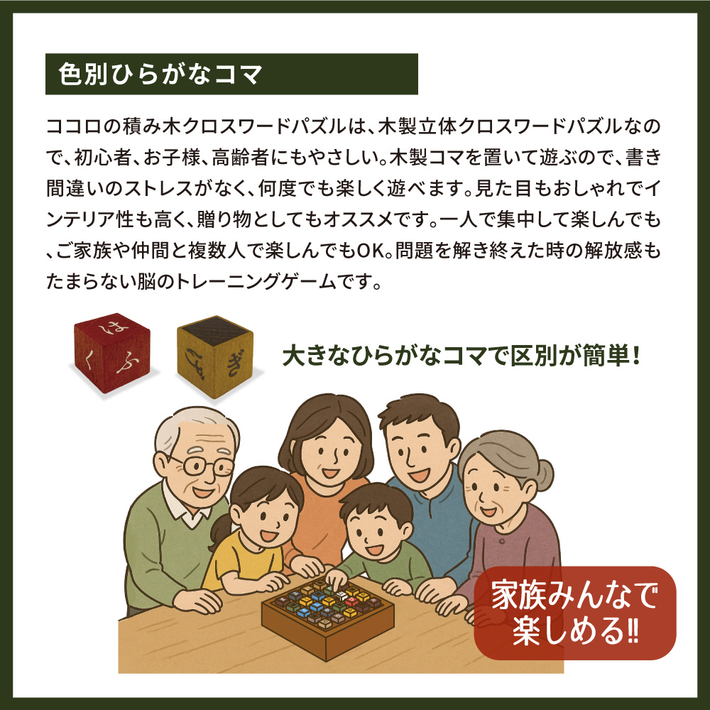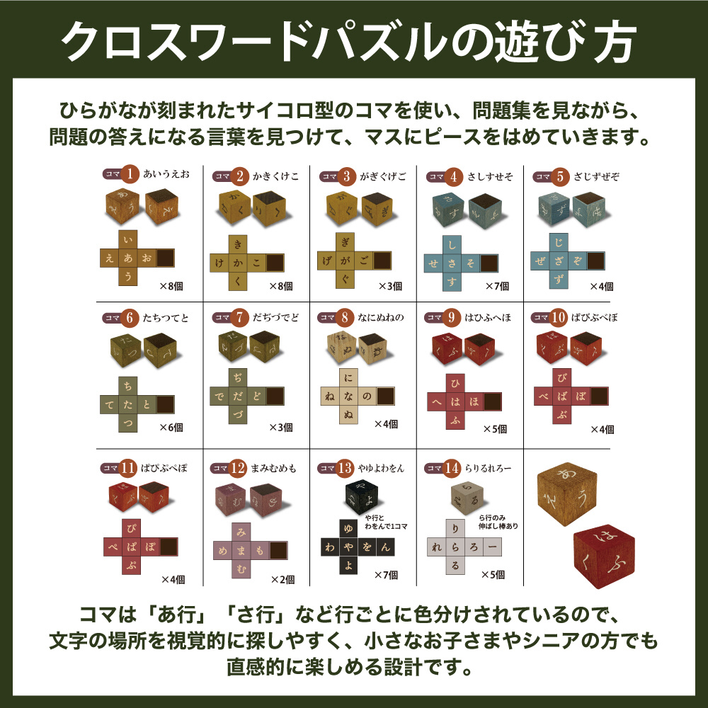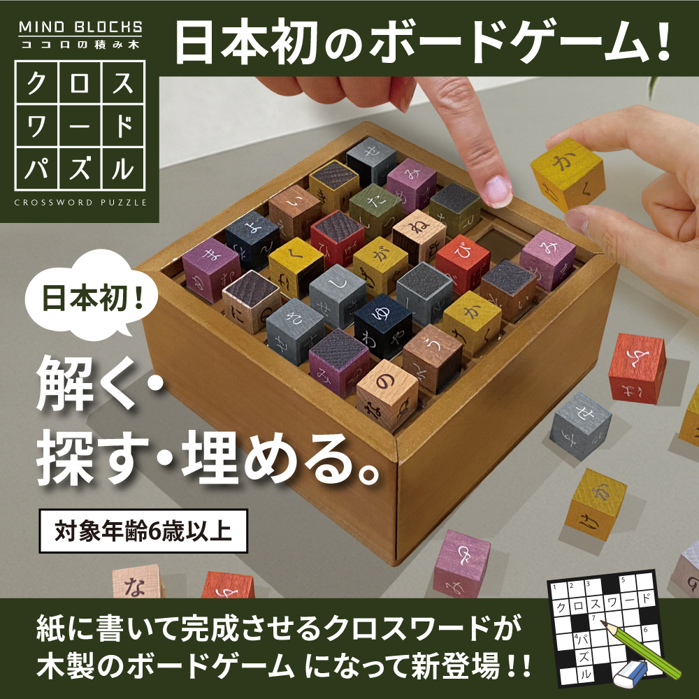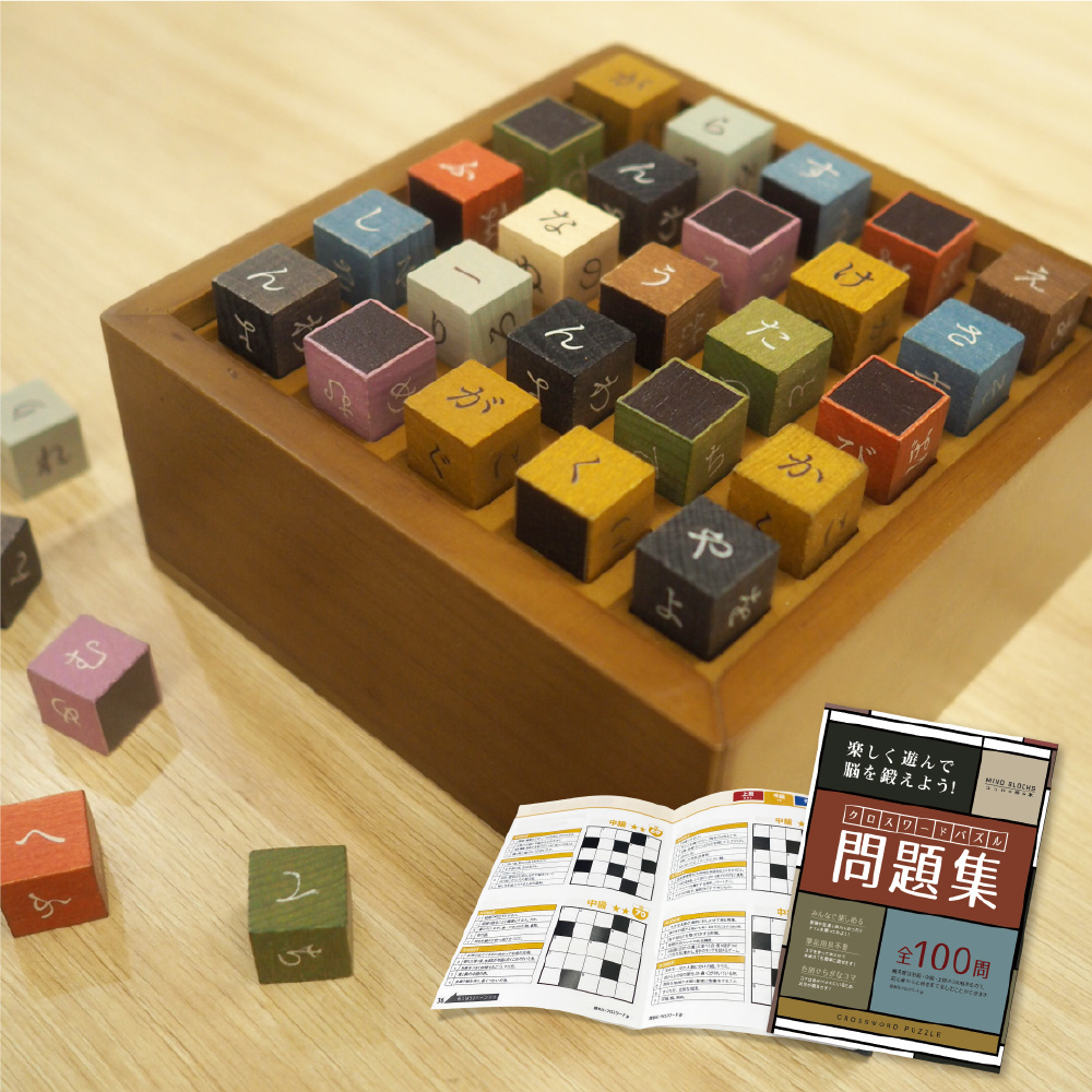 木製で楽しめる”クロスワードパズル”。筆記用具いらずで、コマを使って遊ぶので、間違えても何度でも簡単にやり直せます。一人でコツコツやるのも良し、みんなでワイワイやるのも良し。全100問の問題集付きです。