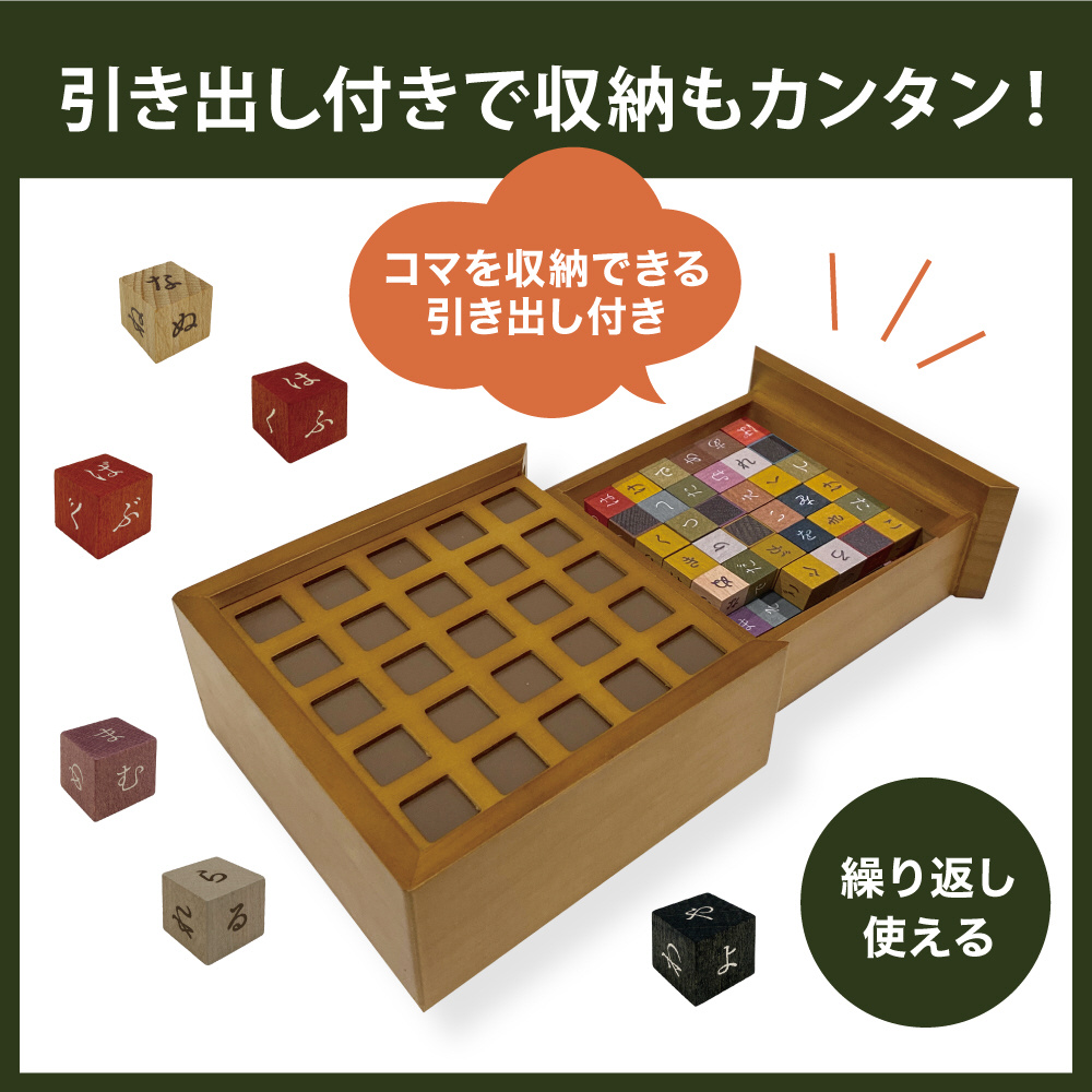 色別ひらがなコマで簡単に区別可能。温かみを感じる木製で何度でも遊べる。