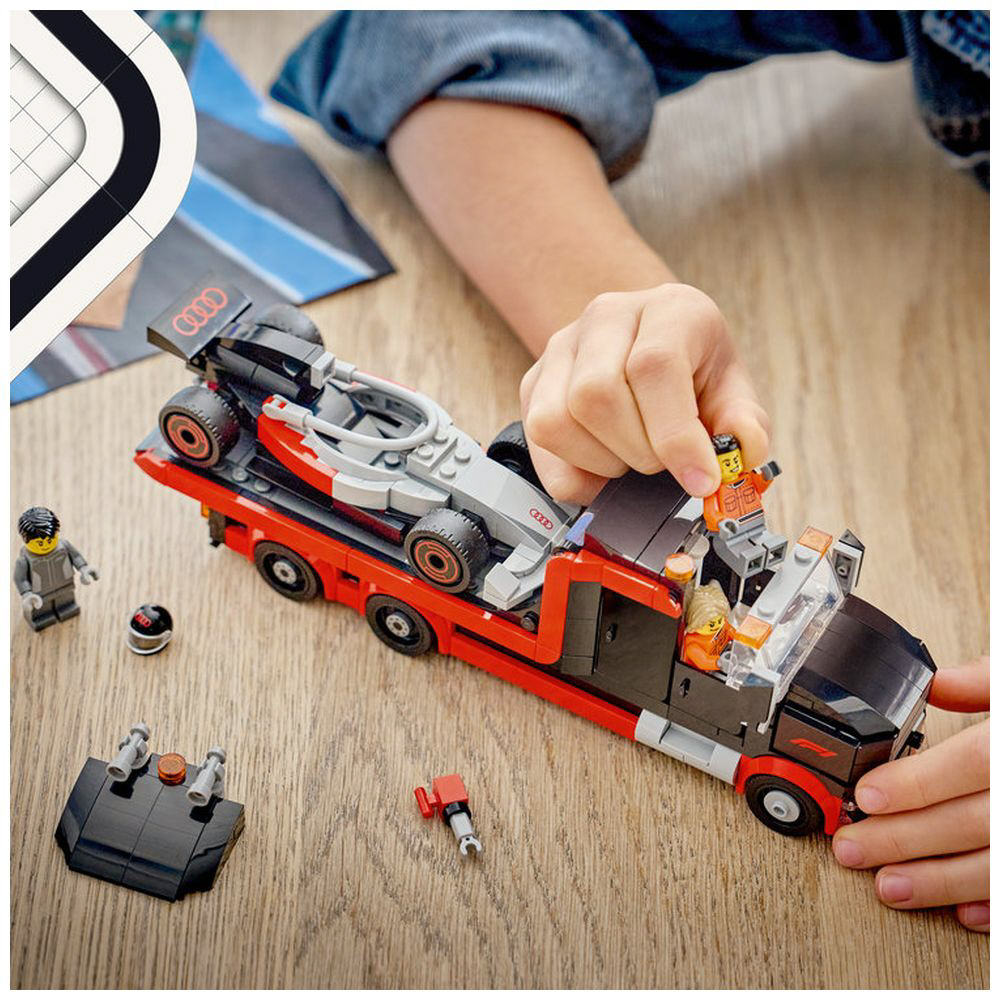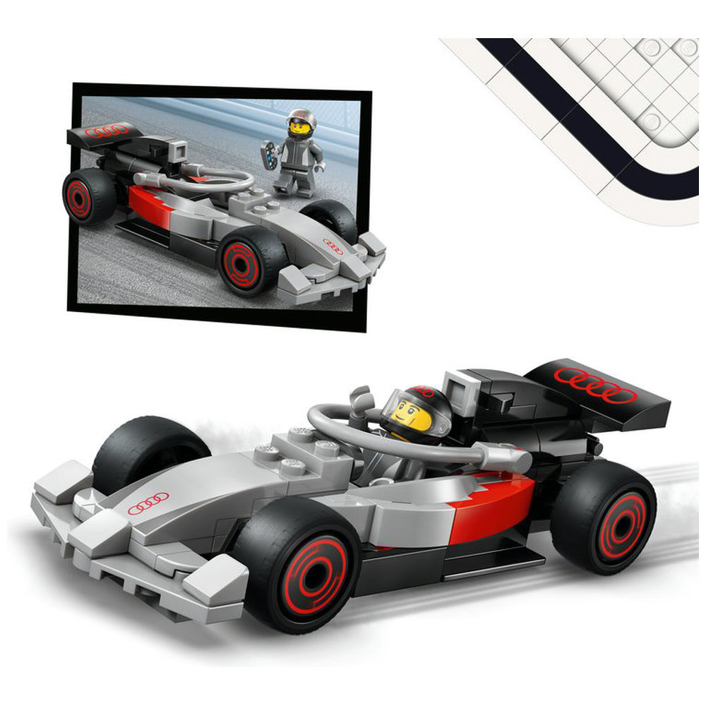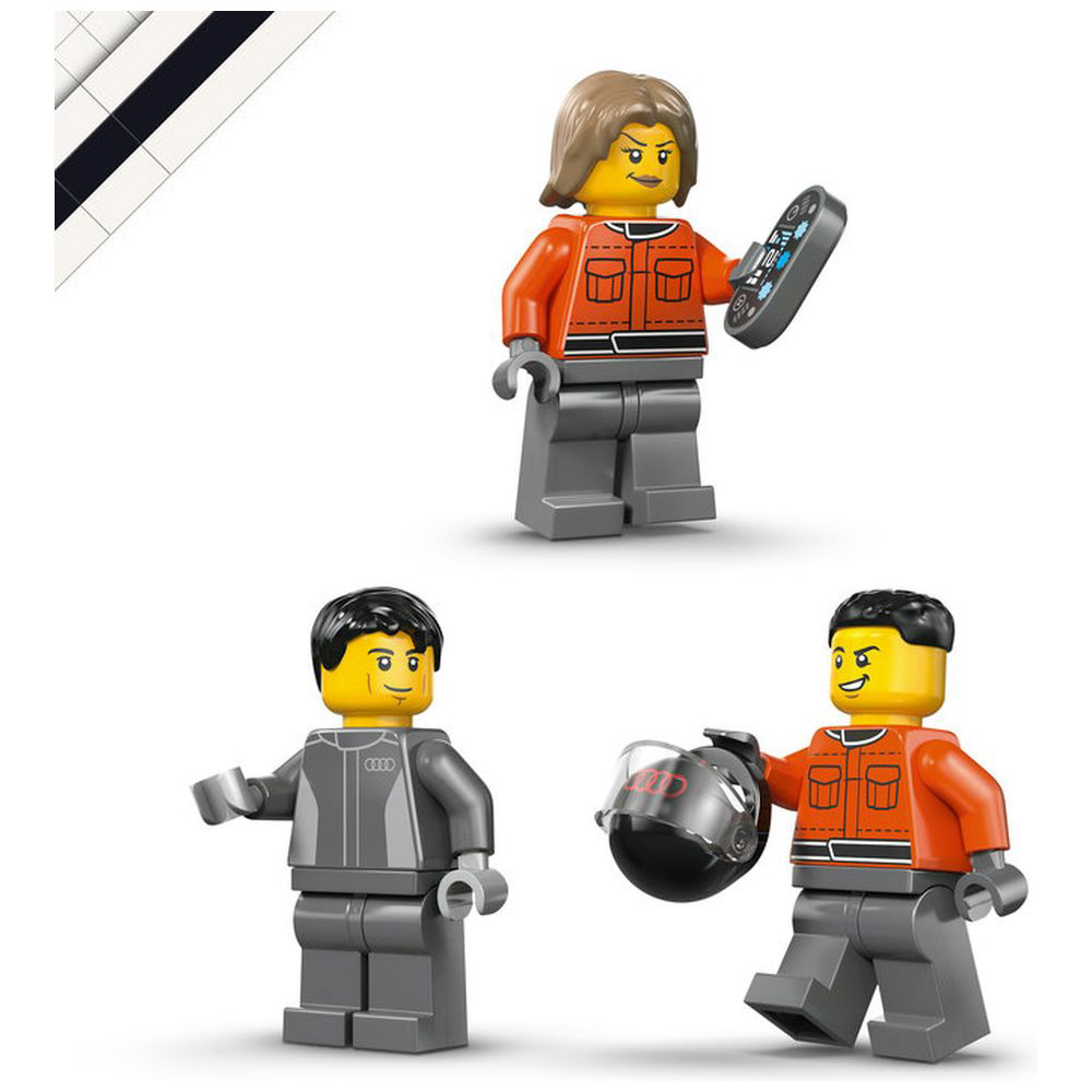 Audiドライバー1体とピットクルー2体のミニフィギュアに加え、F1をテーマにした多彩なアクセサリーが付属し、空想のごっこ遊びを盛りあげます。