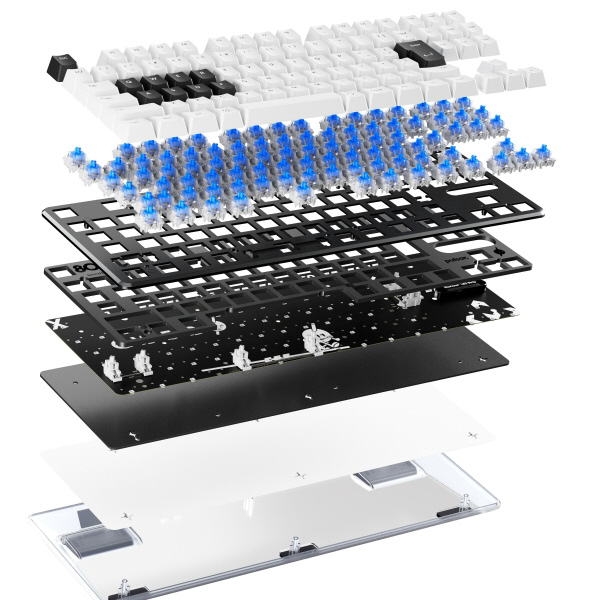 本キーボードは、3層の吸音構造(トリプルサウンドダンピング構造)を採用し、打伴音を抑えながら快適なタイピング体験を実現します。内部PCBの上下に配置された一次・二次吸音材が、キー入力時に発生する振動やノイズを効果的に軽減。さらに底面には厚みのあるシリコンダンピング層を備え、共鳴音を抑えます。この設計により、ゲーム中はもちろん作業時でも周囲を気にせず使用でき、静かで快適な環境を提供します。