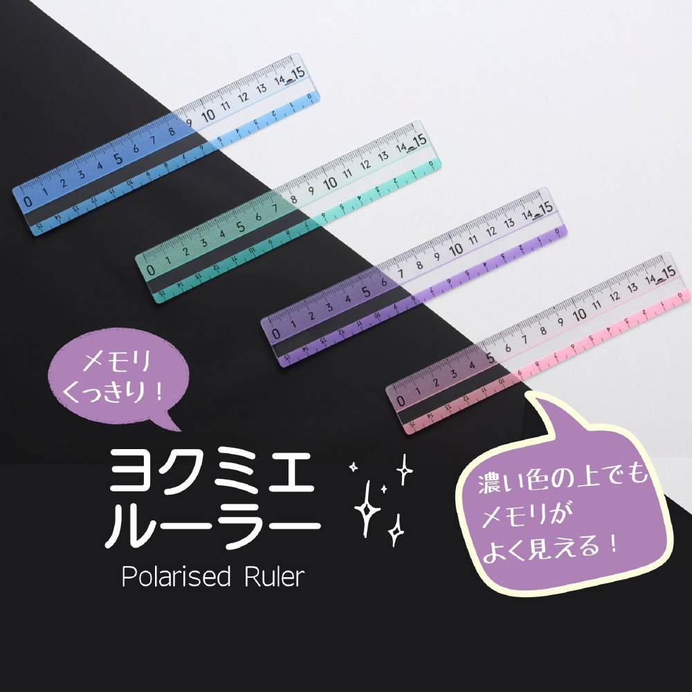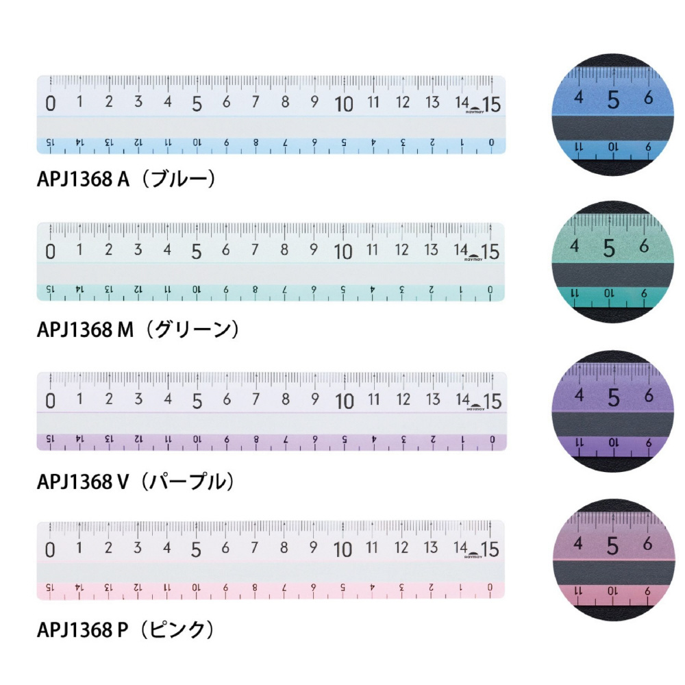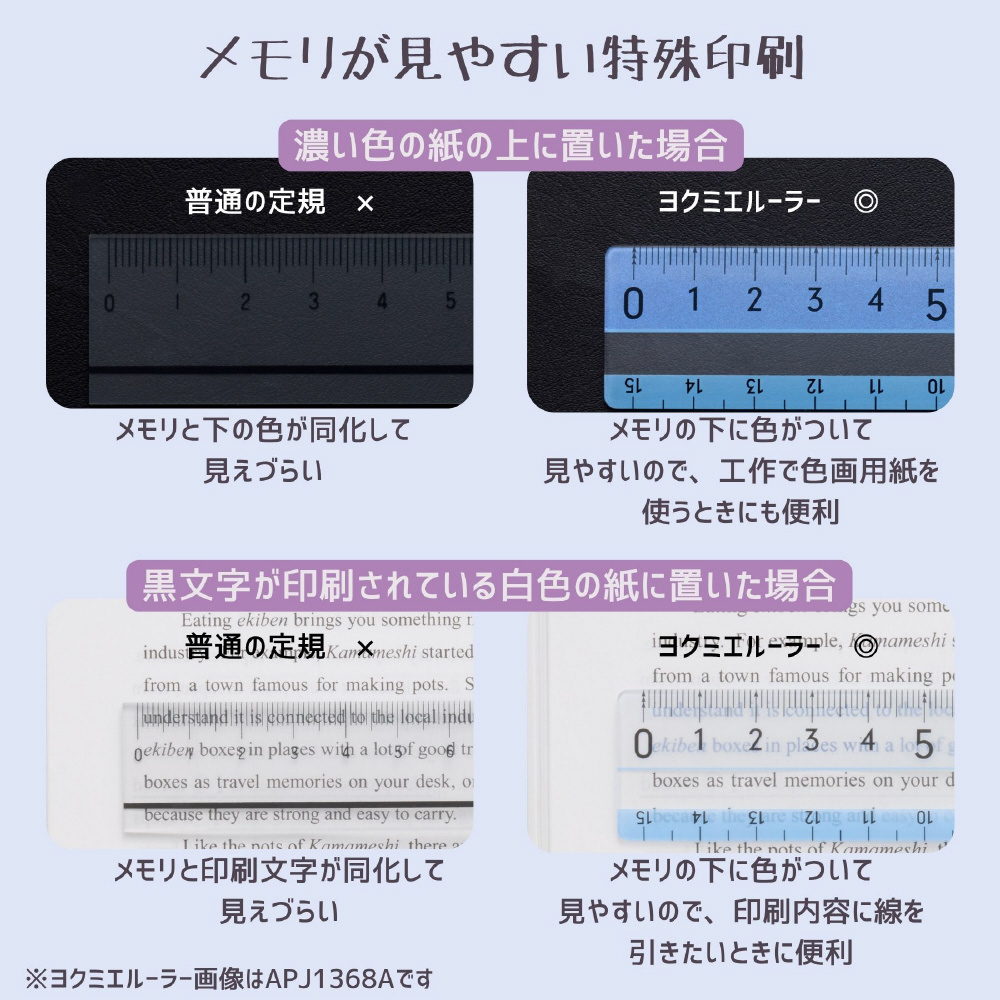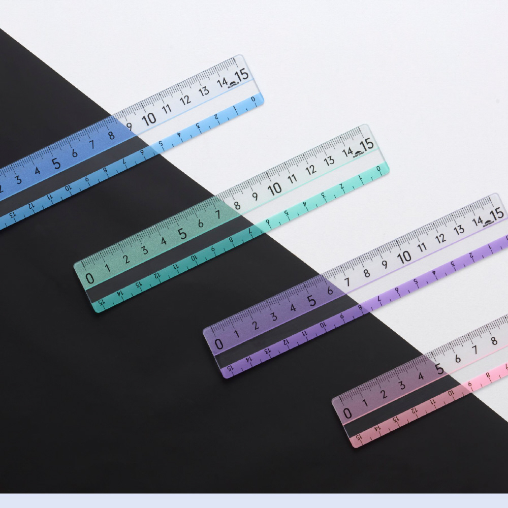 メモリの下に色がつくので、どんな色の上でもメモリがよく見える定規。
