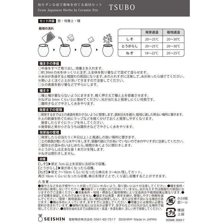 ●育て終えたあとの陶器の壺は、調味料入れや小物入れとして再利用できます。●唐辛子:世界中の料理で重要な薬味として利用されます。発芽温度が高いため、種まきは暖かくなってから行います。●セット内容:壺型陶器/培養土/種