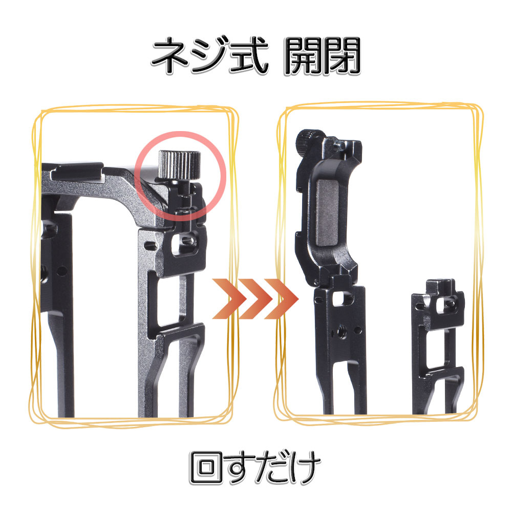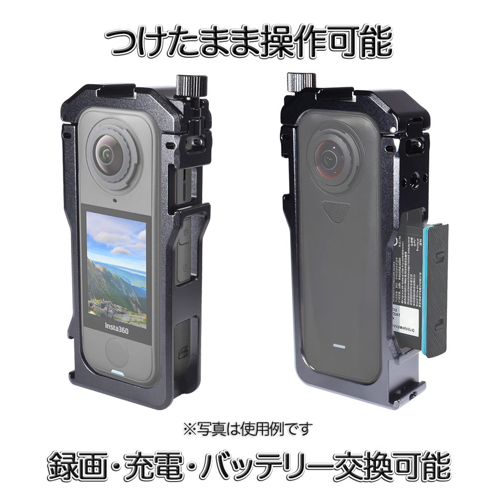 アルミニウム合金製で、悪天候やアウトドアシーンでも安心して使用可能。撮影・操作・充電の邪魔にならない設計で、装着したままバッテリー交換もできます。